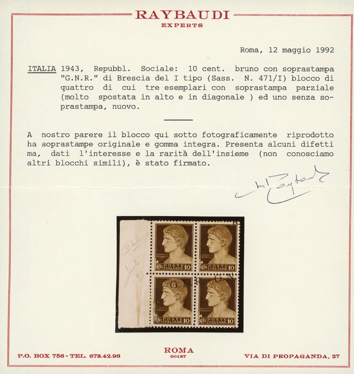 1943 - 10 cent. soprastampa G.N.R. di Brescia, I tipo, blocco di quattro, un esemplare senza soprastampa, tre con soprastampa obliqua, ... Read more