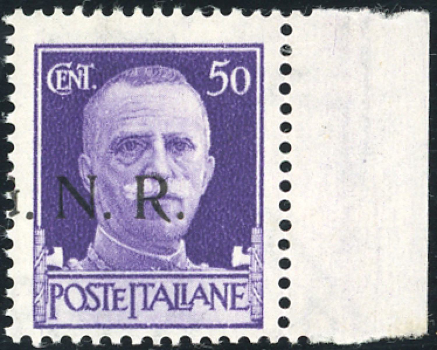 1943 - 50 cent. soprastampa G.N.R. di Brescia, I tipo, solo NR in soprastampa (477/Ifb), bordo di foglio, gomma originale integra, ... Read more