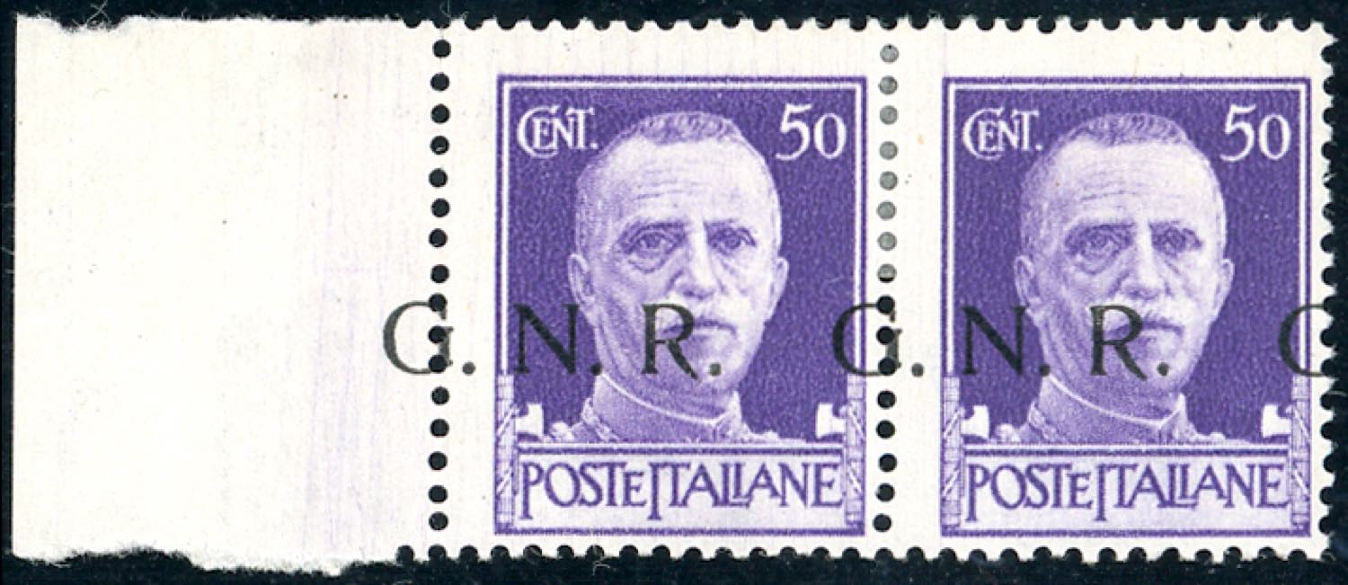 1943 - 50 cent. soprastampa G.N.R. di Brescia del I tipo, fortemente spostata a sinistra, coppia orizzontale con le varietà 477/Ifba e ... Read more
