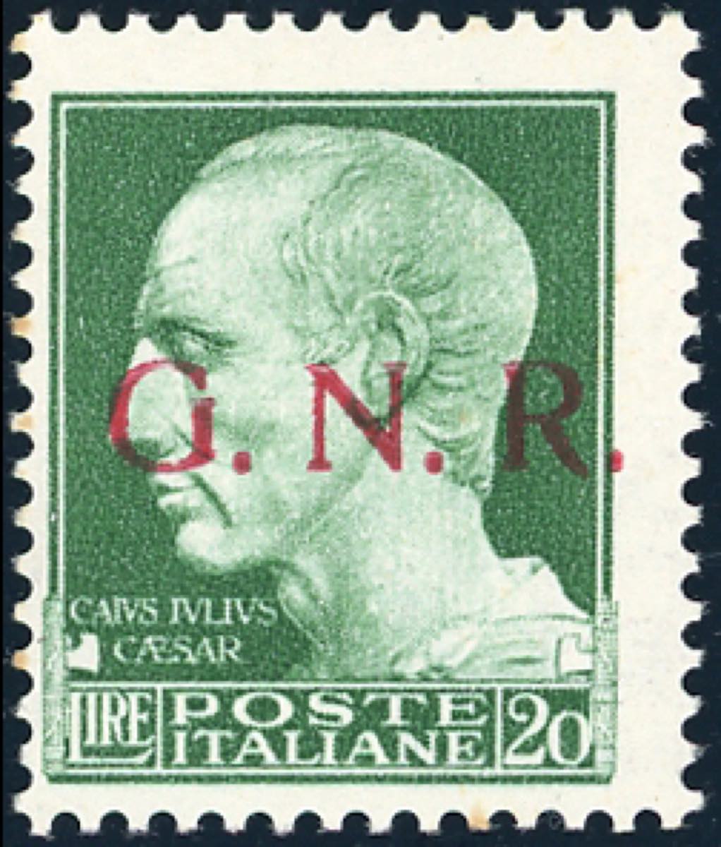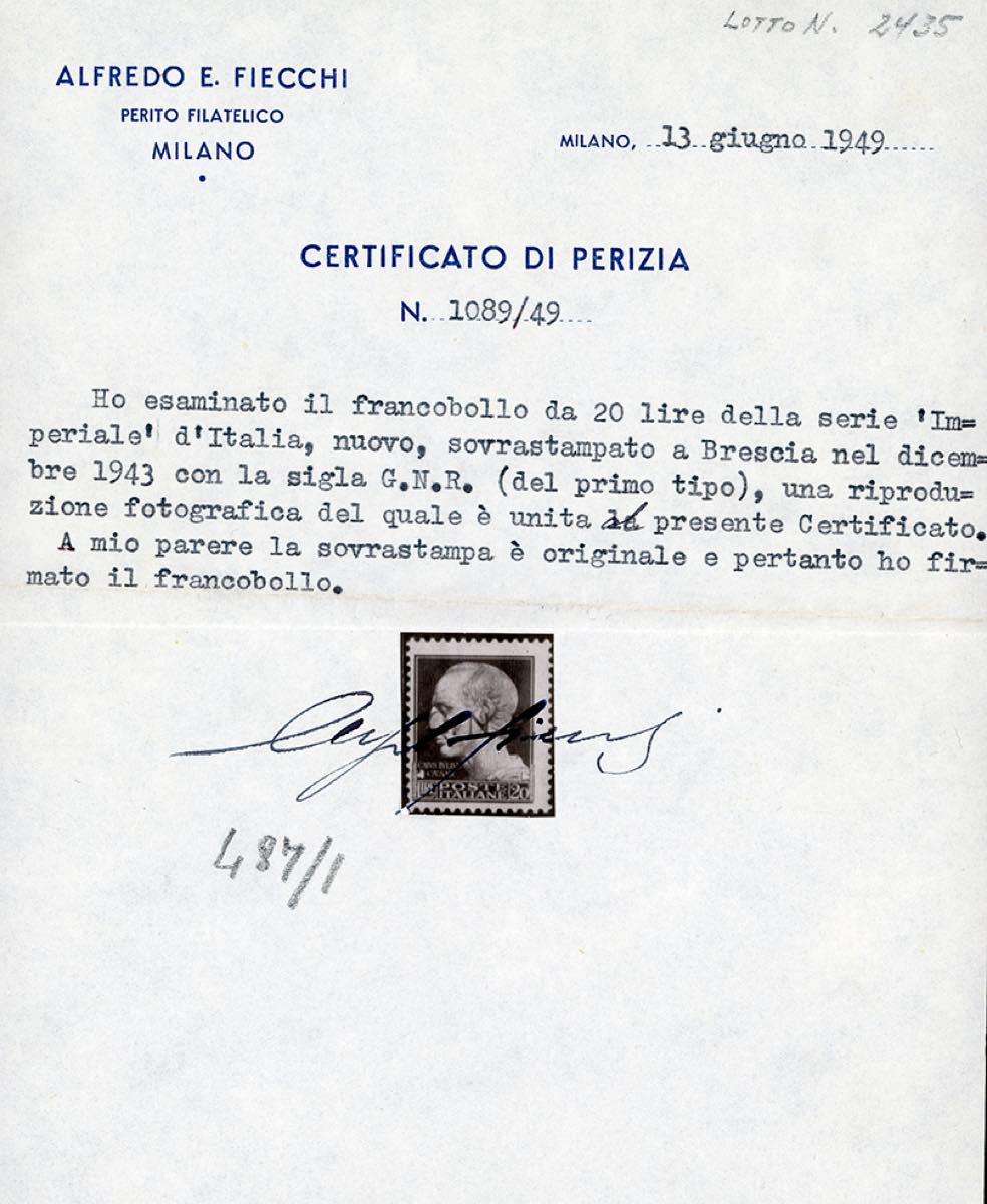 1943 - 20 lire soprastampa G.N.R. di Brescia, I tipo (487/I), gomma originale, leggerissima traccia di linguella, perfetto e di ottima ... Read more