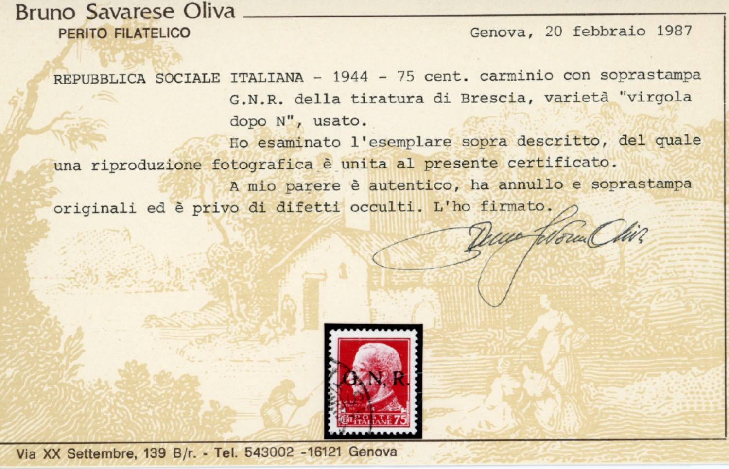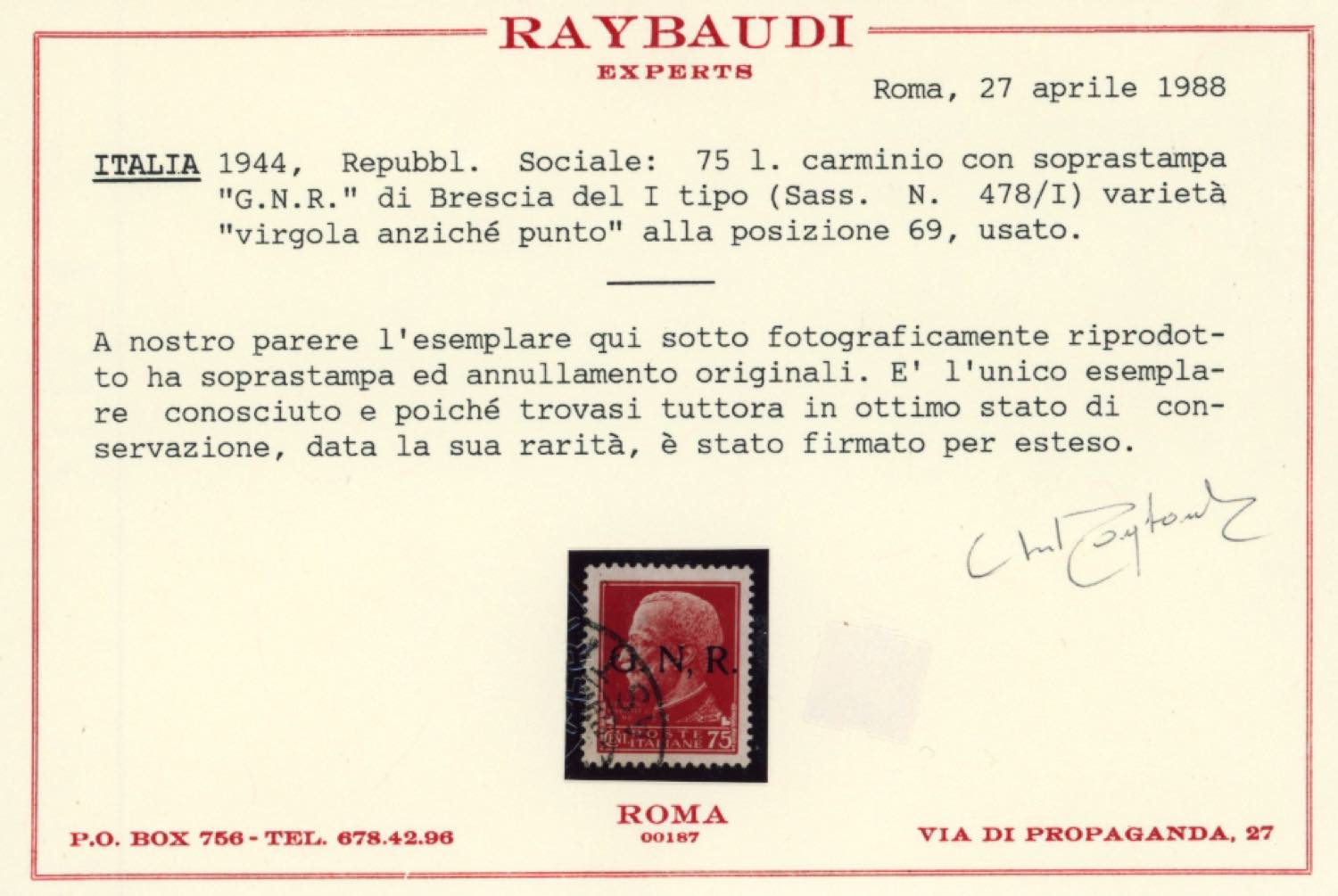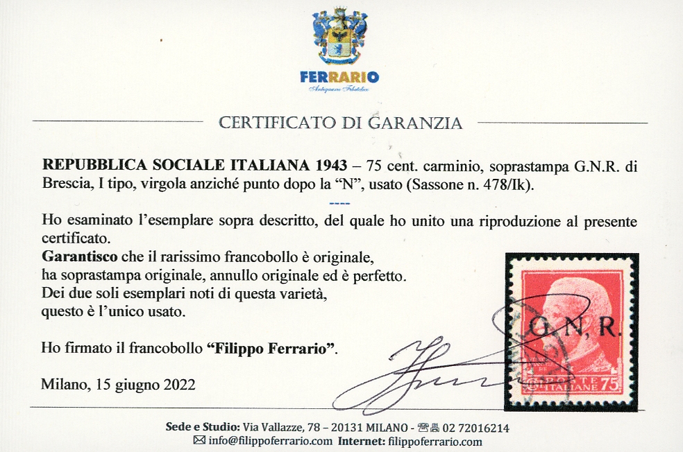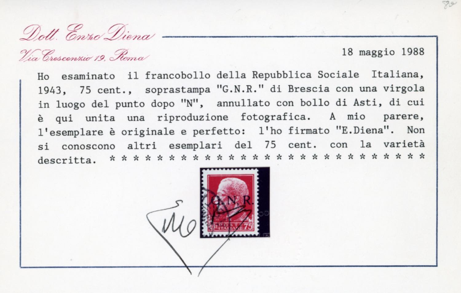 1943 - 75 cent. soprastampa G.N.R. di Brescia, I tipo, virgola anziché punto dopo la N (478/IK), usato, perfetto e di ottima qualità. Dei due soli esemplari noti di questa varietà, questo è l'unico noto usato. Rarità assoluta della Repubblica Sociale Italiana. Sorani, cert. Raybaudi, E.Diena e Ferrario.