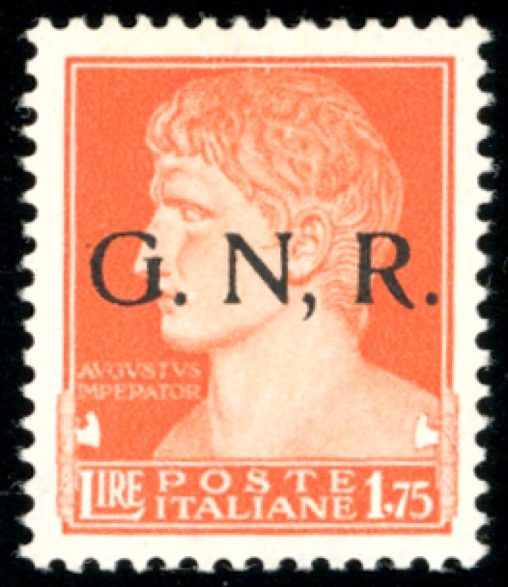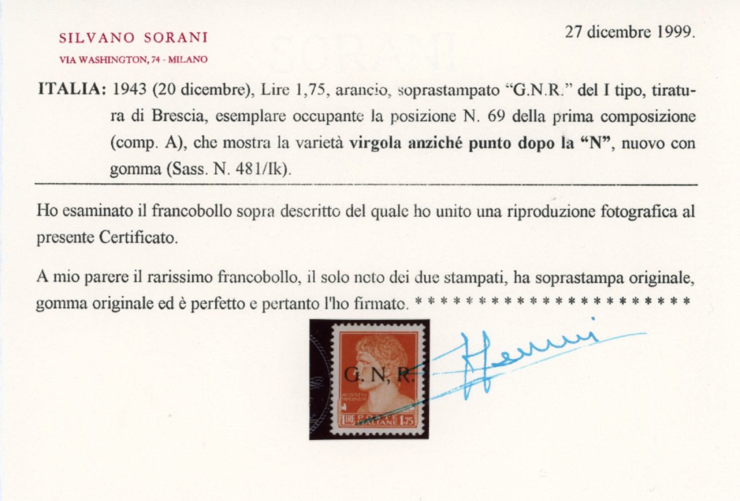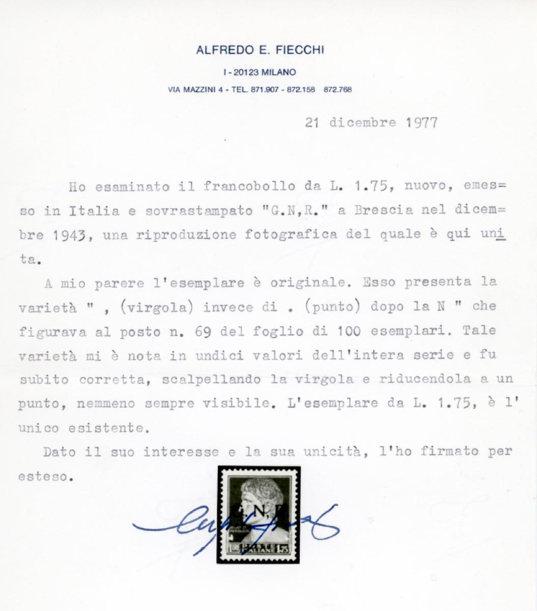 1943 - 1,75 lire soprastampa G.N.R. di Brescia, I tipo, virgola anziché punto dopo la N (481/IK), gomma originale, lieve linguella, perfetto. UNICO ESEMPLARE NOTO. Grandissima rarità della Repubblica Sociale Italiana, in splendide condizioni qualitative. Cert. Sorani, Fiecchi e Ferrario.