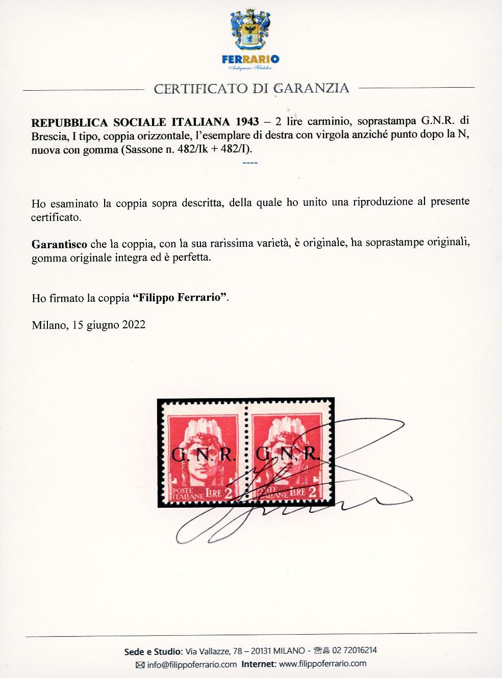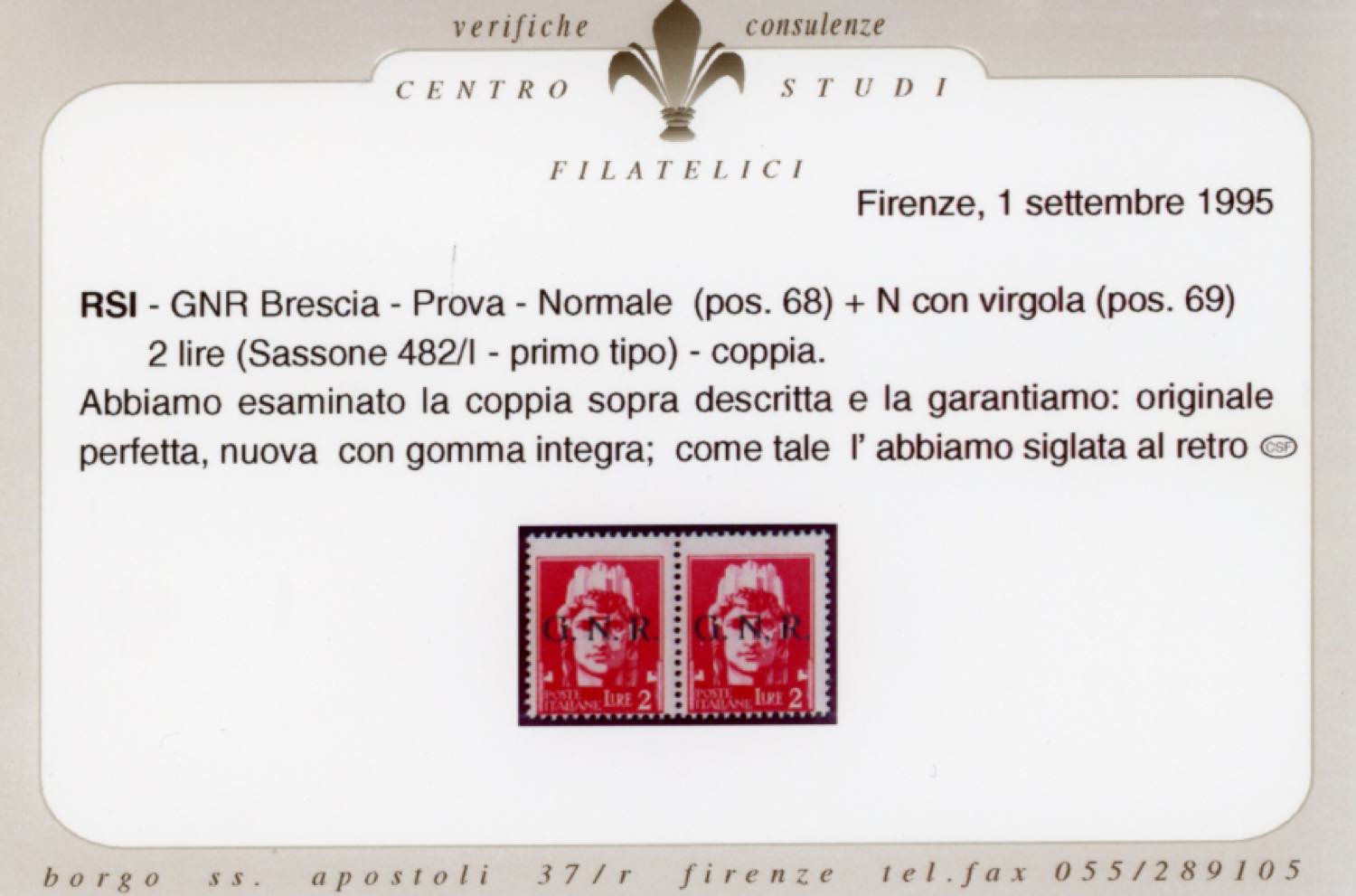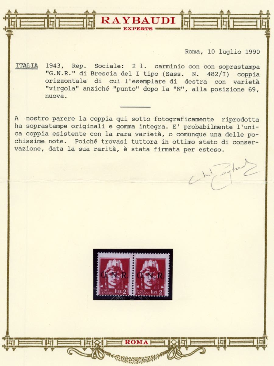 1943 - 2 lire soprastampa G.N.R. di Brescia, I tipo, coppia orizzontale, il secondo esemplare con virgola anziché punto dopo la N (482/IK), gomma originale integra, perfetta e di ottima qualità. Si tratta probabilmente dell'UNICA COPPIA NOTA con questa varietà. Sorani, cert. Oro Raybaudi e Ferrario.