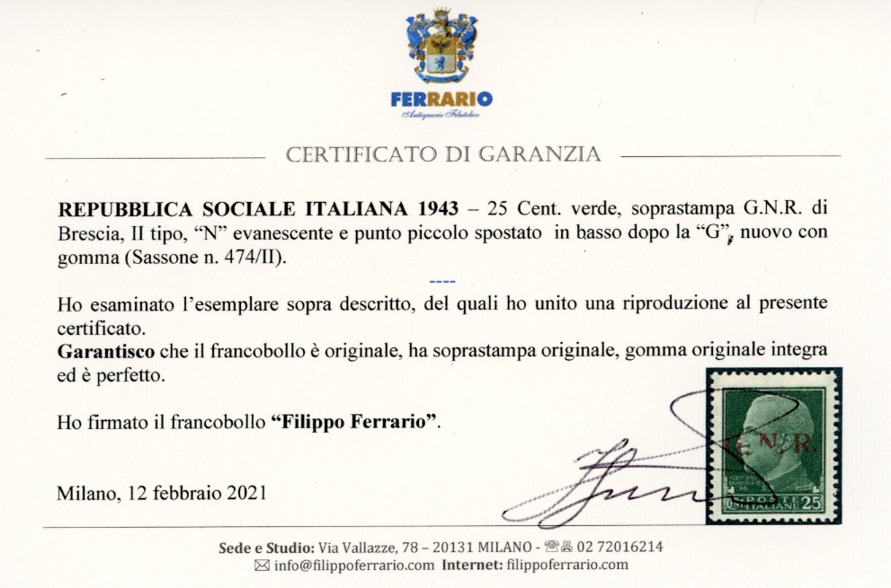 1943 - 25 cent., soprastampa G.N.R. di Brescia, II tipo, "N" evanescente e punto piccolo spostato in basso dopo la "G" (474/II), gomma integra, perfetto. Rarissimo, tiratura sei esemplari.