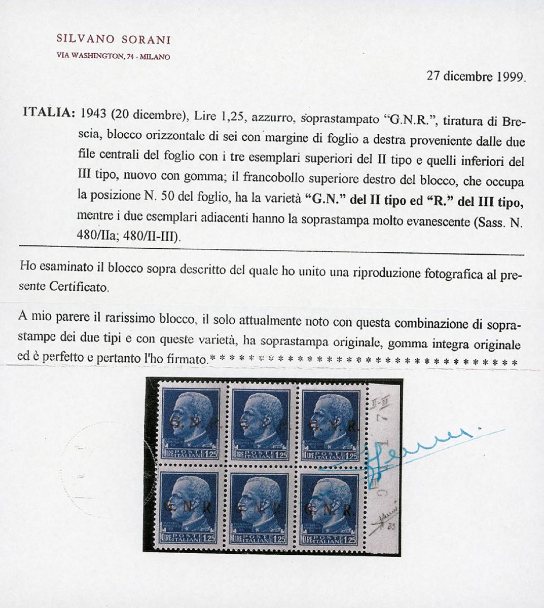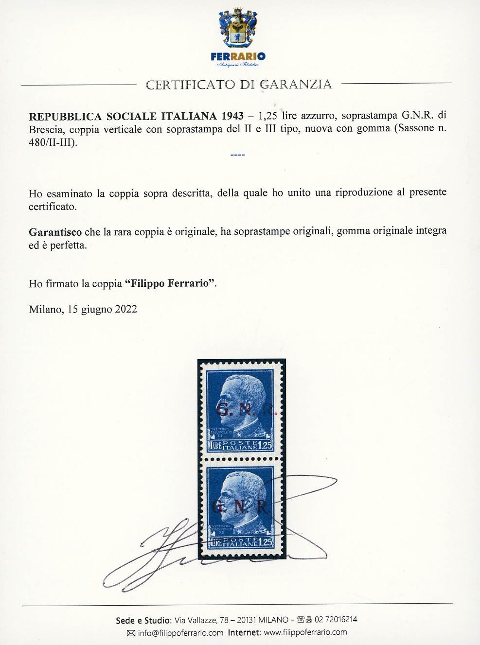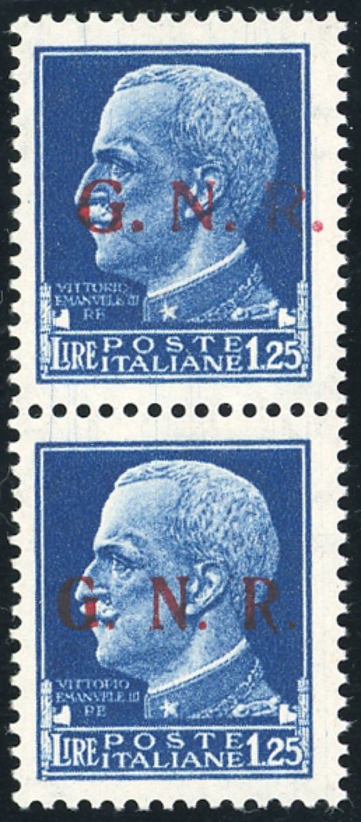 1943 - 1,25 lire soprastampa G.N.R. di Brescia, coppia verticale con soprastampa del II e III tipo (480/II-III), gomma originale integra, perfetta. Splendida ed estremamente rara. Mondolfo, cert. Sorani del blocco di provenienza, cert. Ferrario.
