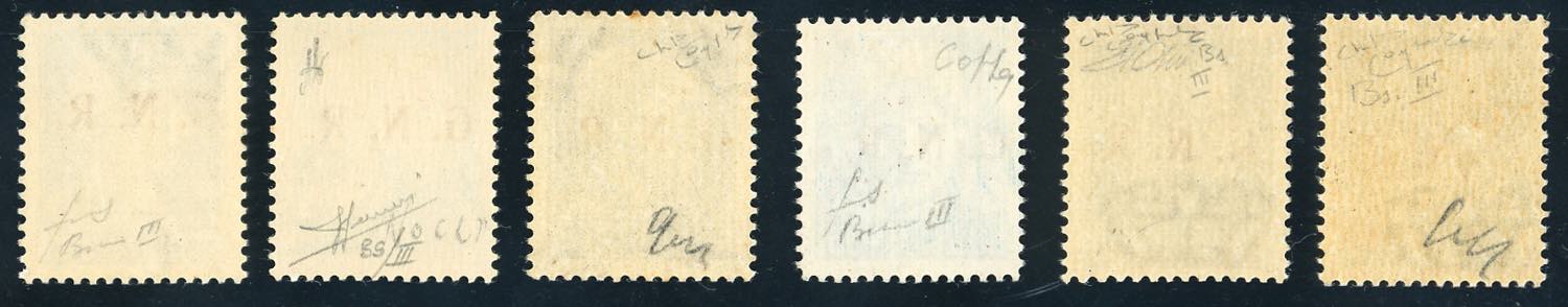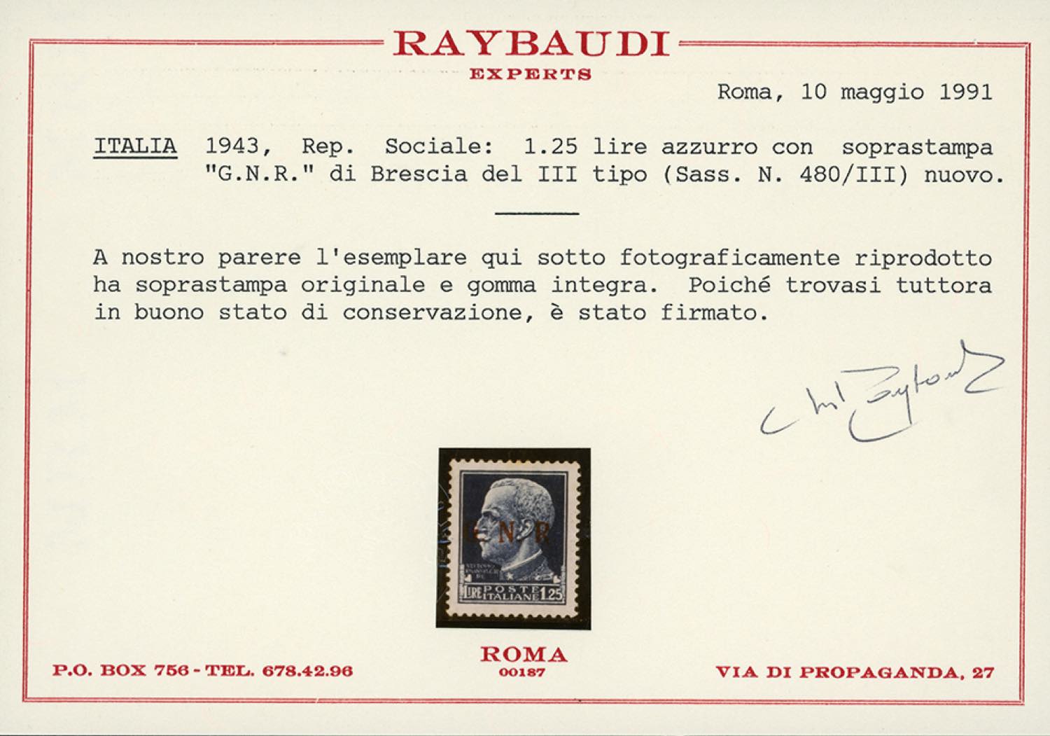 1943 - Soprastampa G.N.R. di Brescia, III tipo, serie completa di sei valori (472/III-488/III), gomma originale integra, perfetti e di ottima qualità, ad eccezione di un basso valore con un punto di ossidazione. Molto rari. Tutti firmati da noti periti, un cert. Colla e tre Raybaudi.