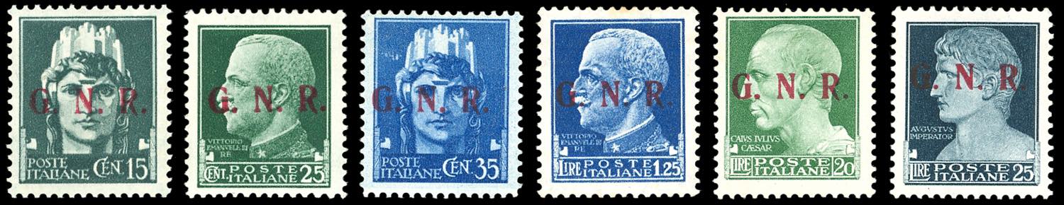 1943 - Soprastampa G.N.R. di Brescia, III tipo, serie completa di sei valori (472/III-488/III), gomma originale integra, perfetti e di ... Read more