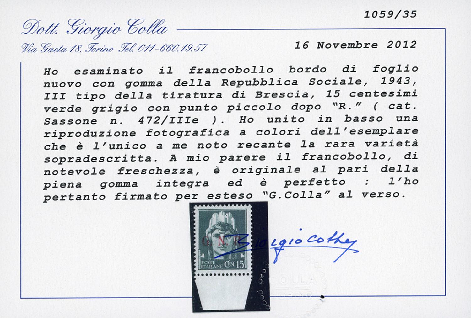 1943 - 15 cent. soprastampa G.N.R. di Brescia, III tipo, punto piccolo dopo la R (472/IIIe), bordo di foglio, gomma originale integra, perfetto. Splendido e molto raro. Raybaudi, Fiecchi, cert. Colla.