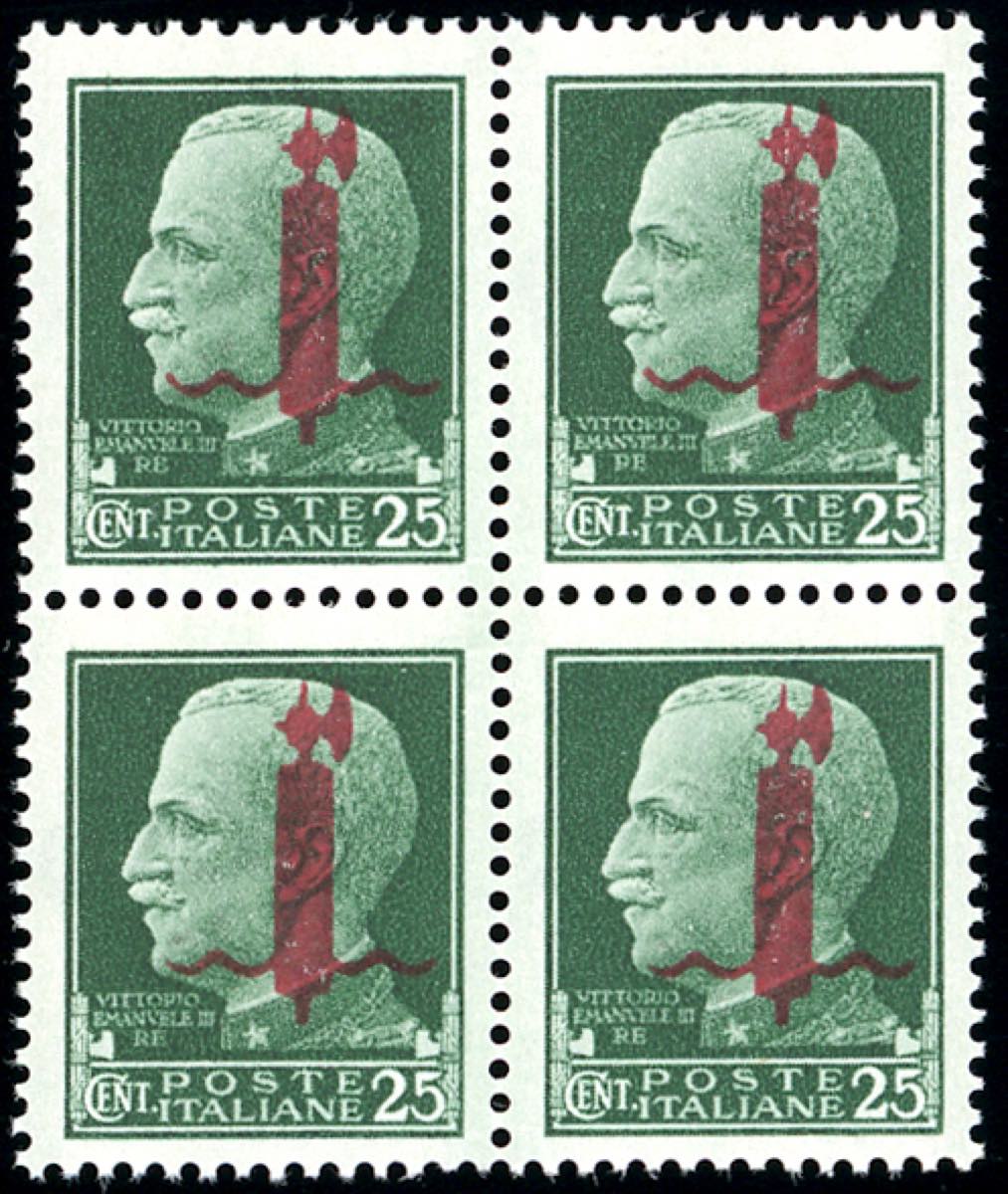 Lot 874 - 1944 - 25 cent. soprastampato fascio in rosso (490), blocco ...