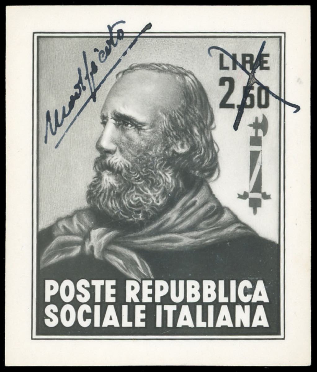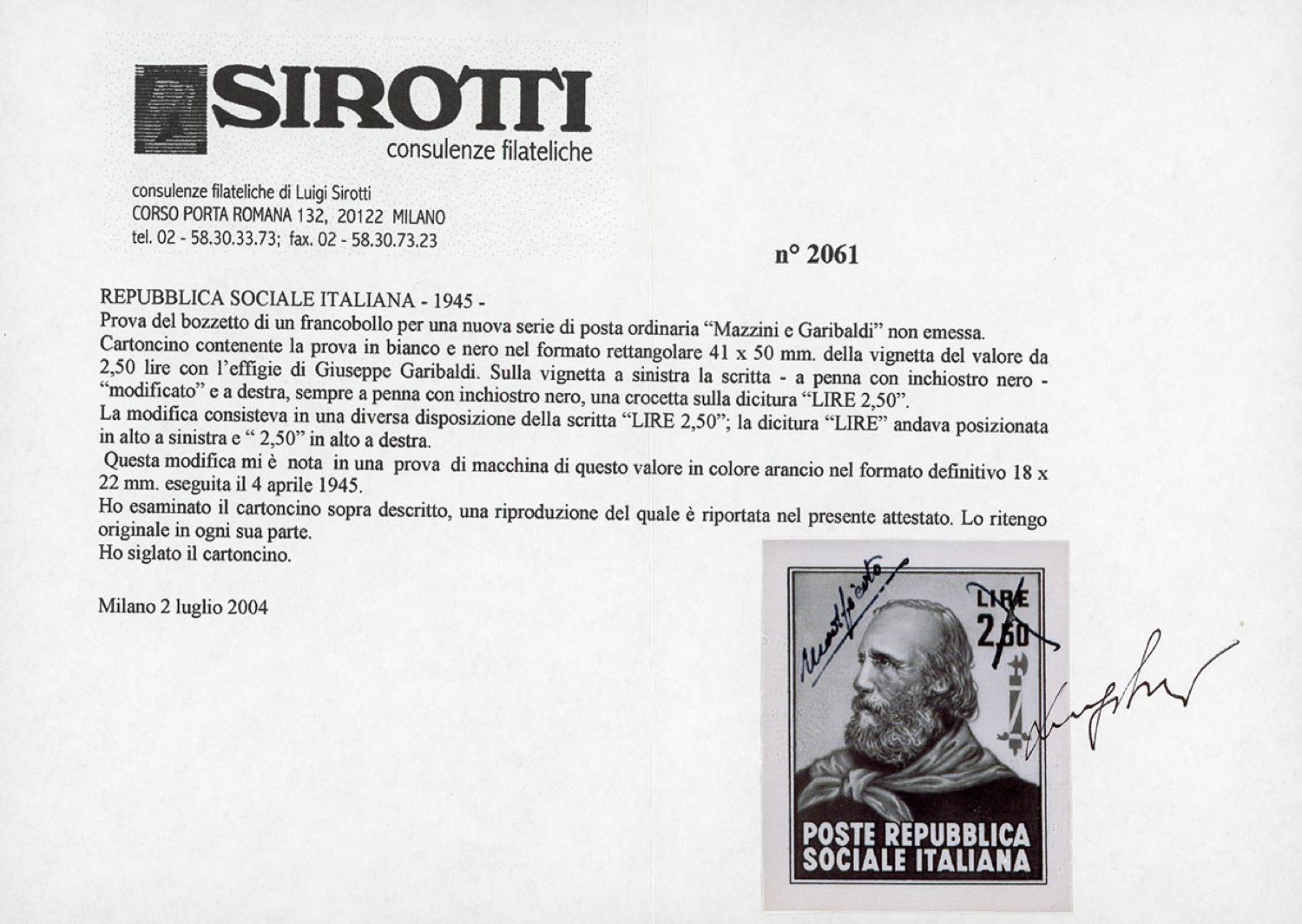 1945 - Cartoncino fotografico (41 x 50 mm.) contenente la prova della vignetta del valore da 2,50 lire con l'effigie di Giuseppe Garibaldi. Compare la scritta con inchiostro nero "modificato" ed una crocetta sul valore facciale, che andava spostato. Questa prova dimostra lo stato d'avanzamento per una serie di posta ordinaria, mai emessa, a soggetto Mazzini e Garibaldi. Rarissima e di grande fascino. Dettagliato cert. Sirotti.