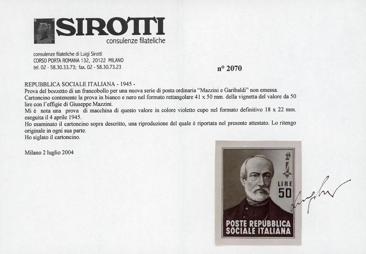 1945 - Cartoncino fotografico (41 x 50 mm.), contenente la prova della vignetta da 50 lire con l'effigie di Giuseppe Mazzini. Questa prova ... Read more