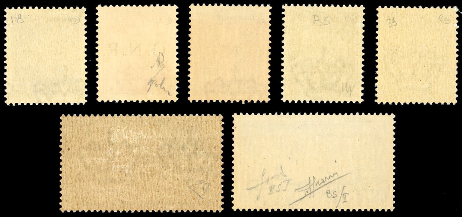 1943 - Soprastampati G.N.R. di Brescia, I tipo, sette valori, manca il 5 lire (117/I-122/I,125/I), gomma originale/integra, alti valori con leggera traccia di linguella. Ottima qualità. Cert. E.Diena per il n. 122/I, Sorani per il n. 125/I.