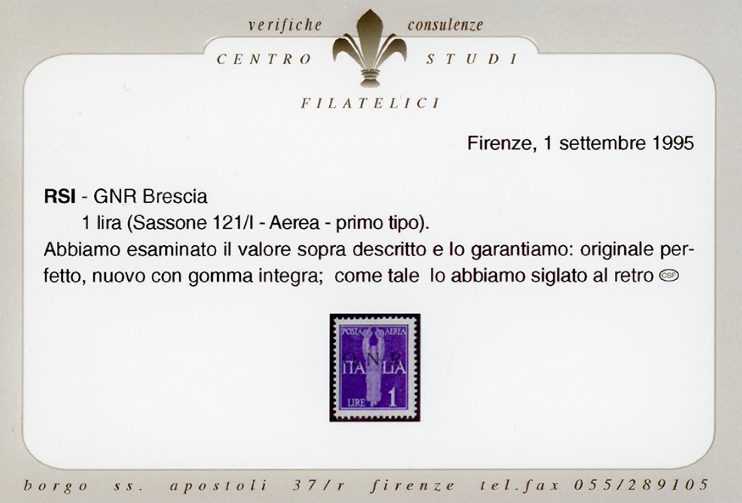 1943 - Soprastampati G.N.R. di Brescia, I tipo, sette valori, manca il 5 lire (117/I-122/I,125/I), gomma originale/integra, alti valori con ... Read more