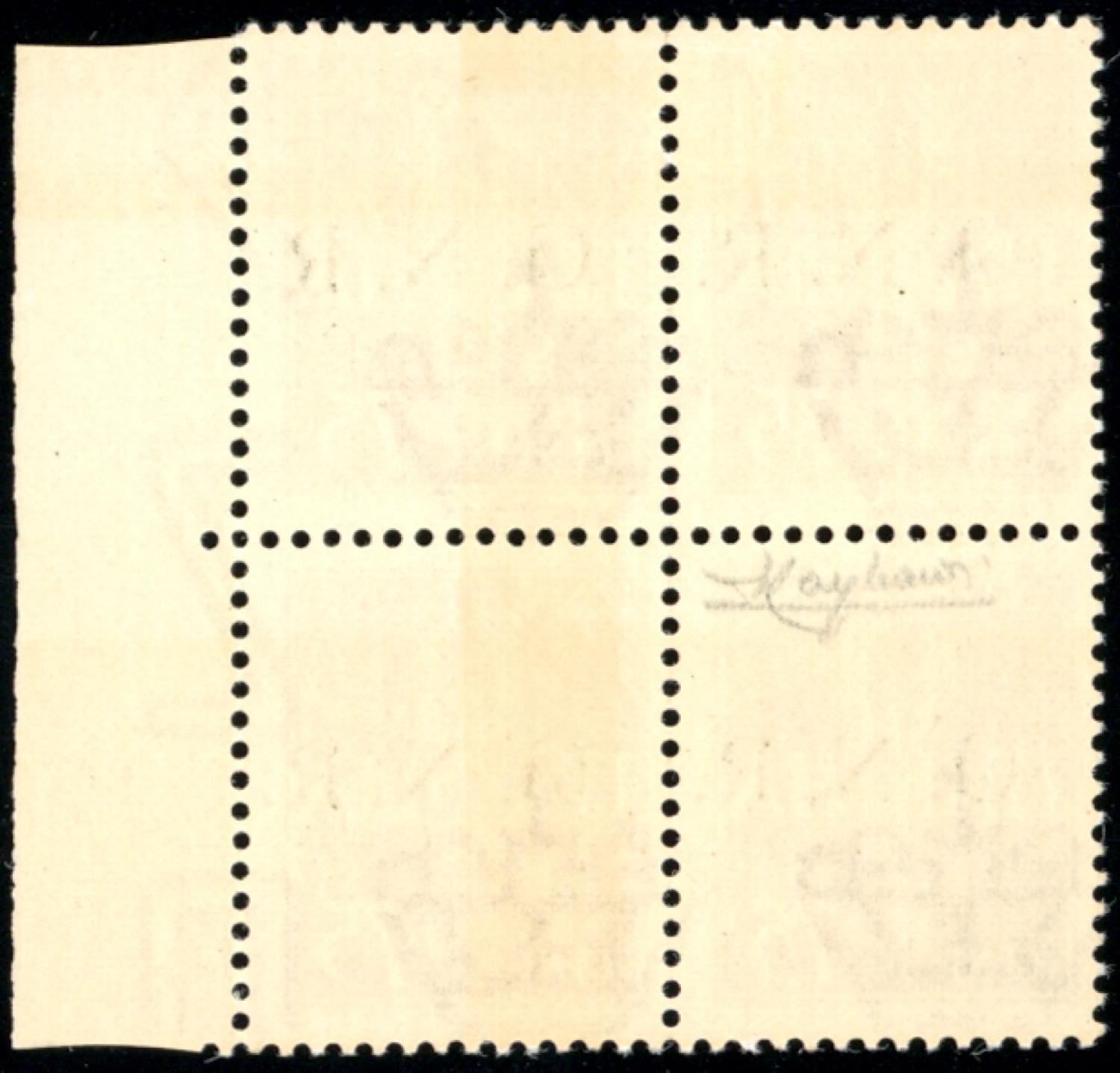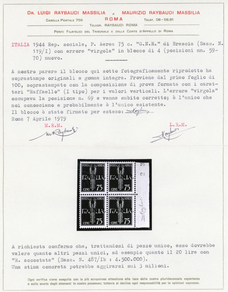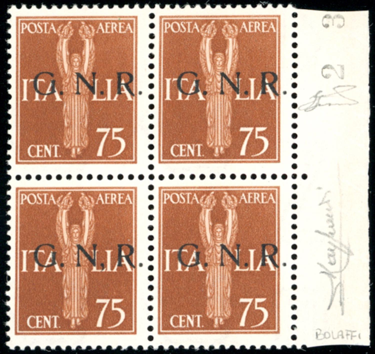 1943 - 75 cent. soprastampa G.N.R. di Brescia, I tipo, blocco di quattro, un esemplare con virgola anziché punto dopo la N (119/Ie), bordo di foglio, gomma originale integra, perfetto. Si tratta dell'UNICO ESEMPLARE NOTO di questa varietà. Grandissima rarità della Repubblica Sociale Italiana. Cert. Raybaudi e Ferrario.