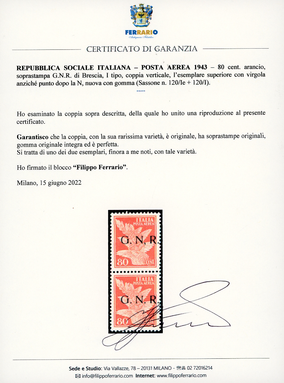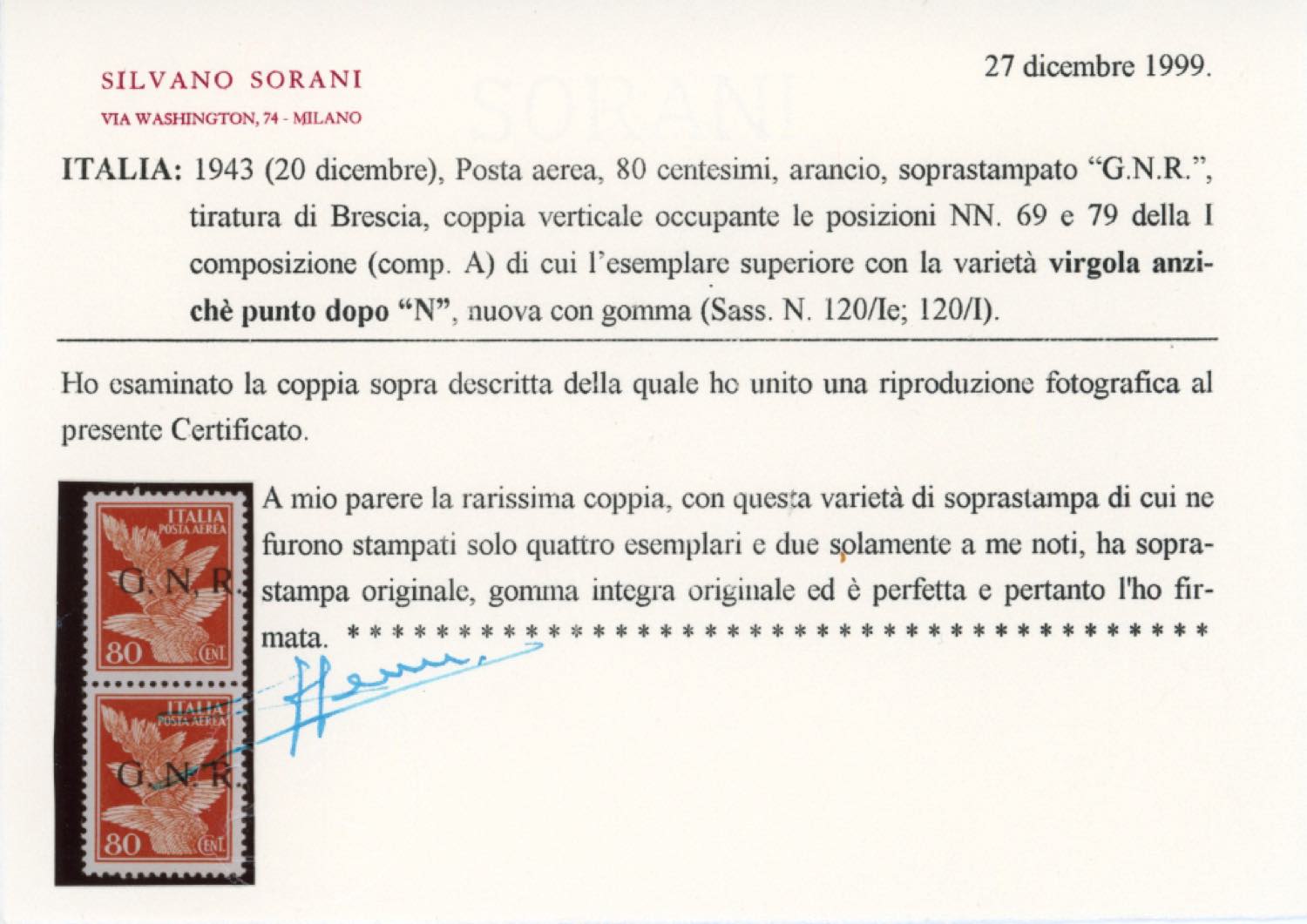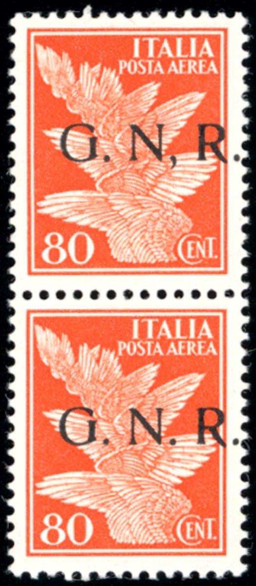 1943 - 80 cent. soprastampa G.N.R. di Brescia, I tipo, coppia verticale, il primo esemplare con la virgola anziché punto dopo la N (120/Ie), gomma originale integra, perfetta e di ottima qualità. Uno dei DUE ESEMPLARI NOTI. Rarità della Repubblica Sociale Italiana. Raybaudi, cert. Sorani e Ferrario.