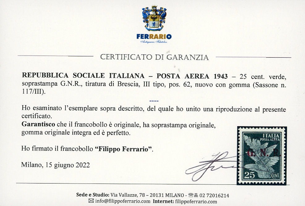 1943 - 25 cent. soprastampa G.N.R. di Brescia, III tipo, pos. 62 (117/III), gomma originale integra, perfetto e di ottima qualità. Raro. Fotocopia cert. Sirotti del blocco di provenienza, Cert. Ferrario.