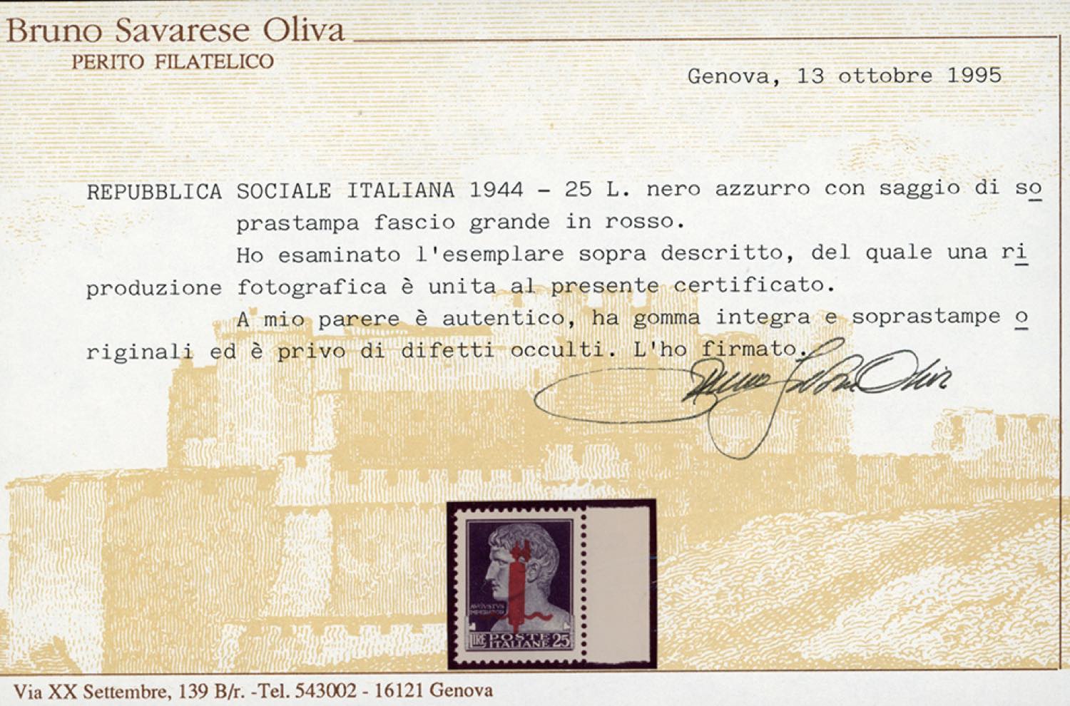 1944 - 25 lire soprastampa fascio in rosso (P25), bordo di foglio, gomma originale integra, perfetto. Raybaudi, Ferrario.