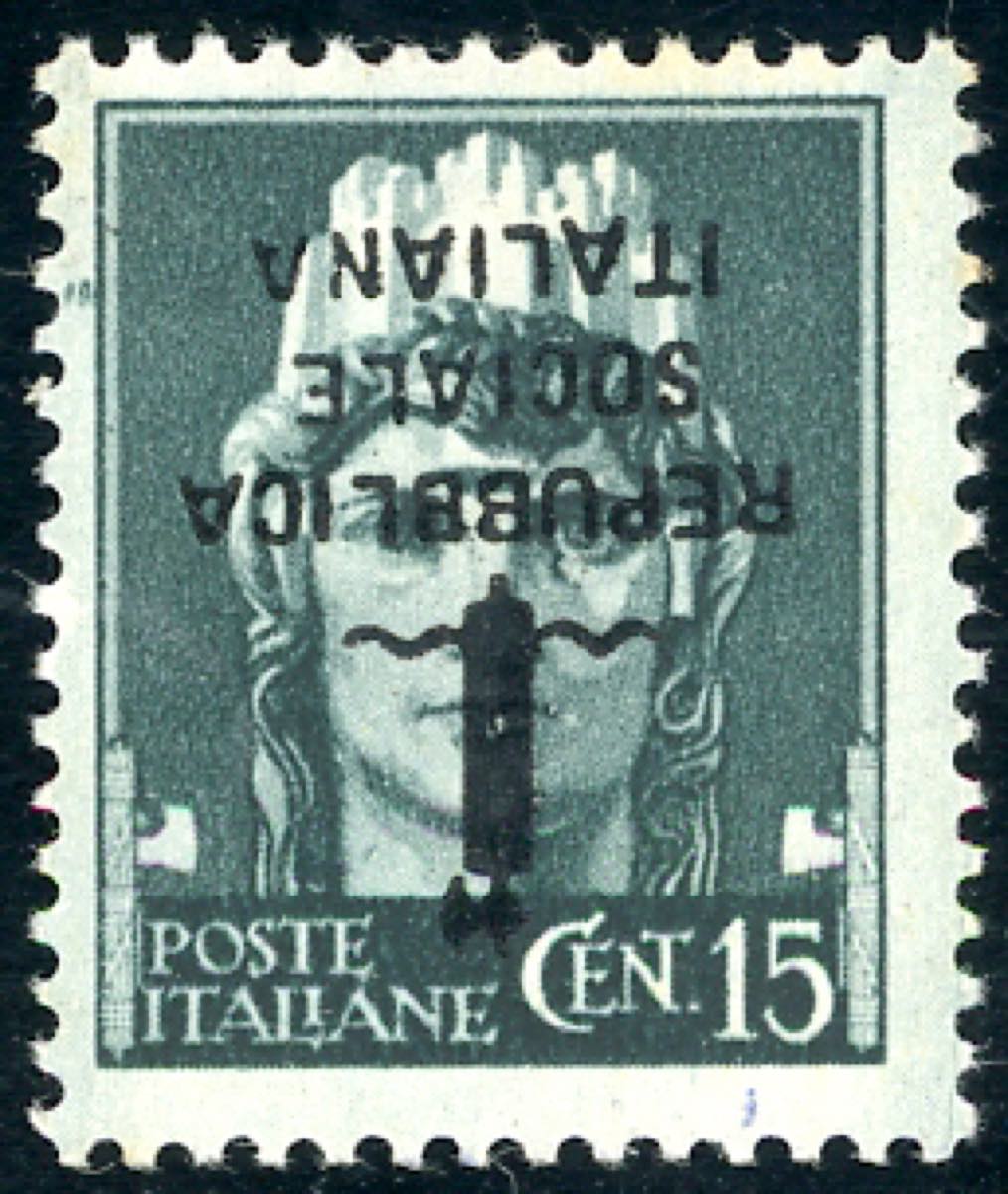 1944 - 15 cent. soprastampa fascetto e Repubblica Sociale Italiana capovolta (P26a), gomma originale integra, perfetto. Ferrario.