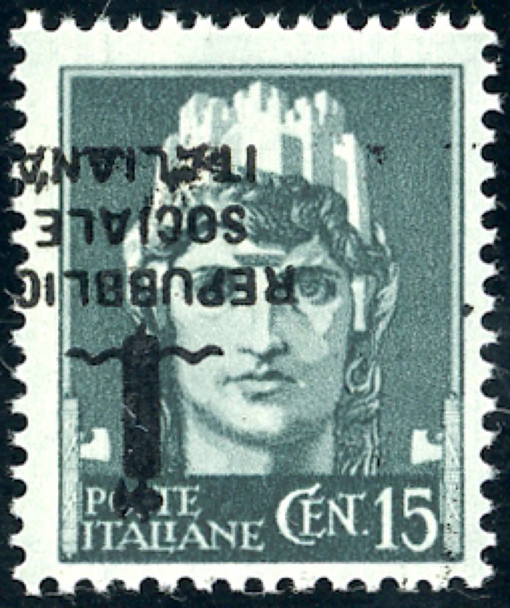 1944 - 15 cent. soprastampa fascetto e Repubblica Sociale Italiana capovolta e fortemente spostata a destra (P26aa), gomma originale ... Read more