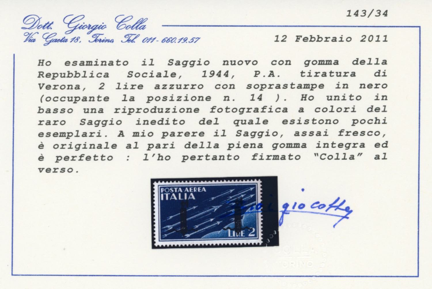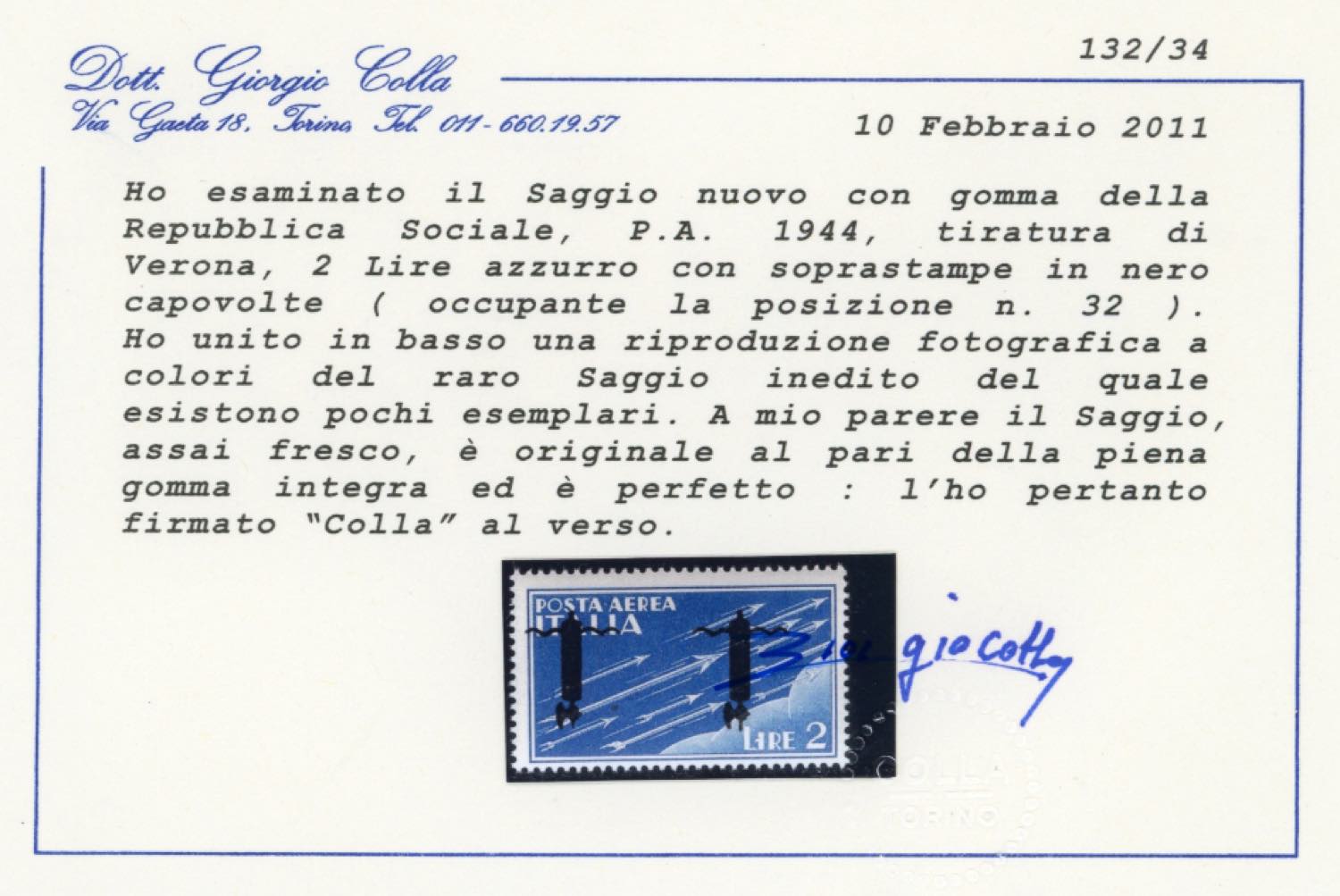 POSTA AEREA 1944 - Soprastampati fascio in nero, ripetuto due volte, tiratura di Verona, serie completa, inoltre 2 lire azzurro con soprastampa capovolta (P15A,P16,P15Aa), gomma originale integra, perfetti. Rari e di ottima qualità. Ferrario, due cert. Colla.