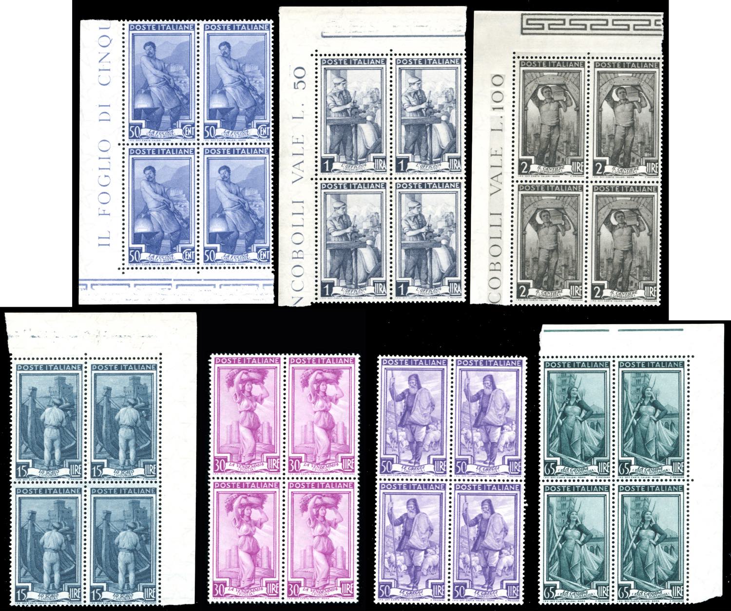 1955/57 - Lavoro, filigrana stelle, serie completa (754/760), ottima centratura, blocchi di quattro, gomma originale integra, perfetti. Ottima qualità.