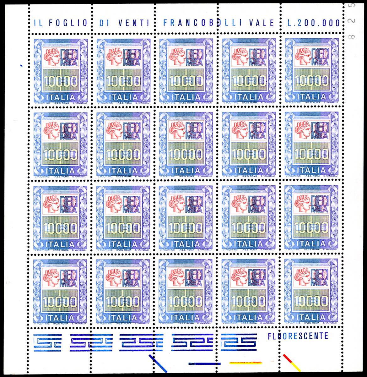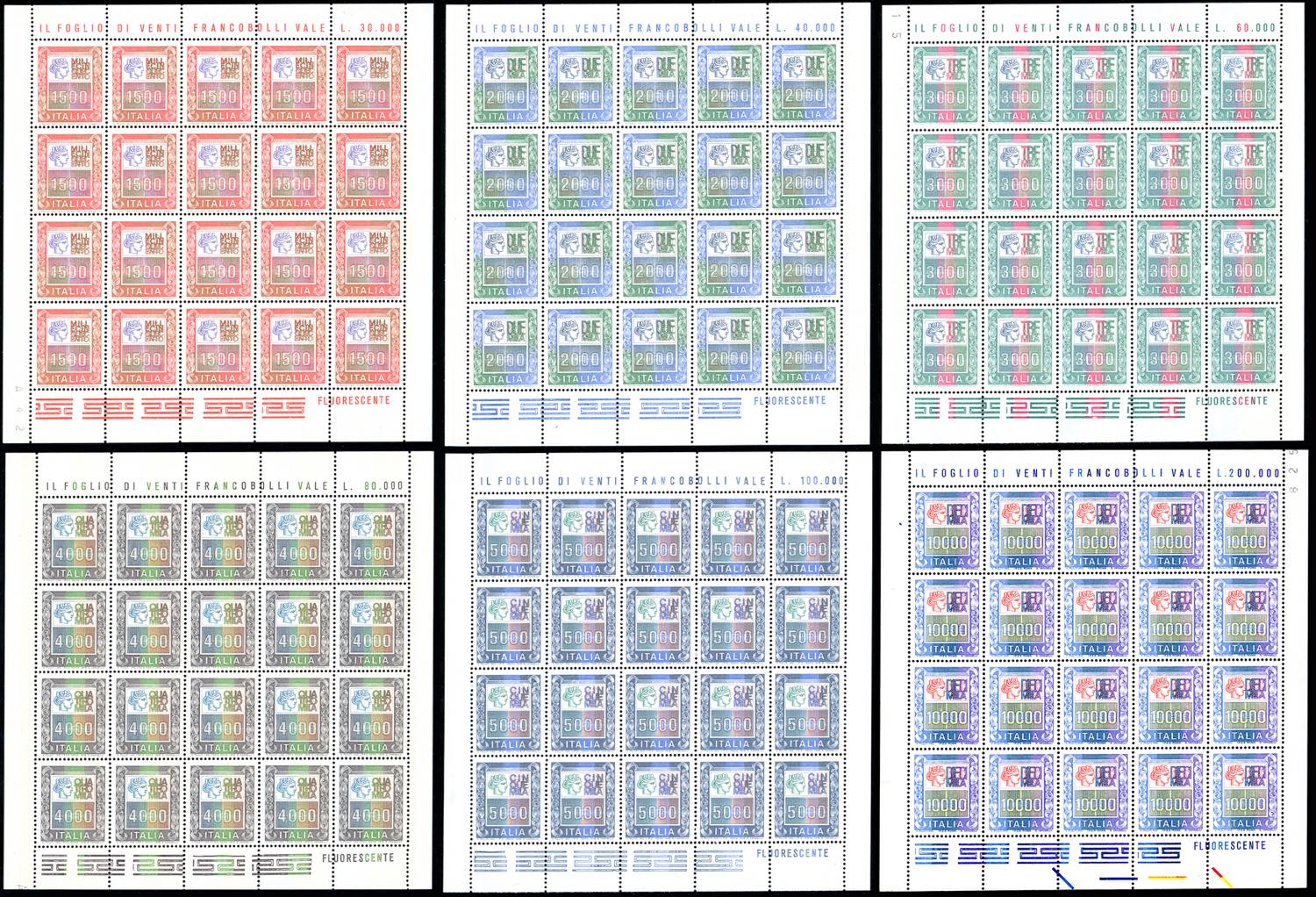 1978/83 - Alti valori, sei minifogli da venti esemplari dei francobolli da 1.500 lire fino a 10.000 lire (1438/1442A), gomma originale ... Read more