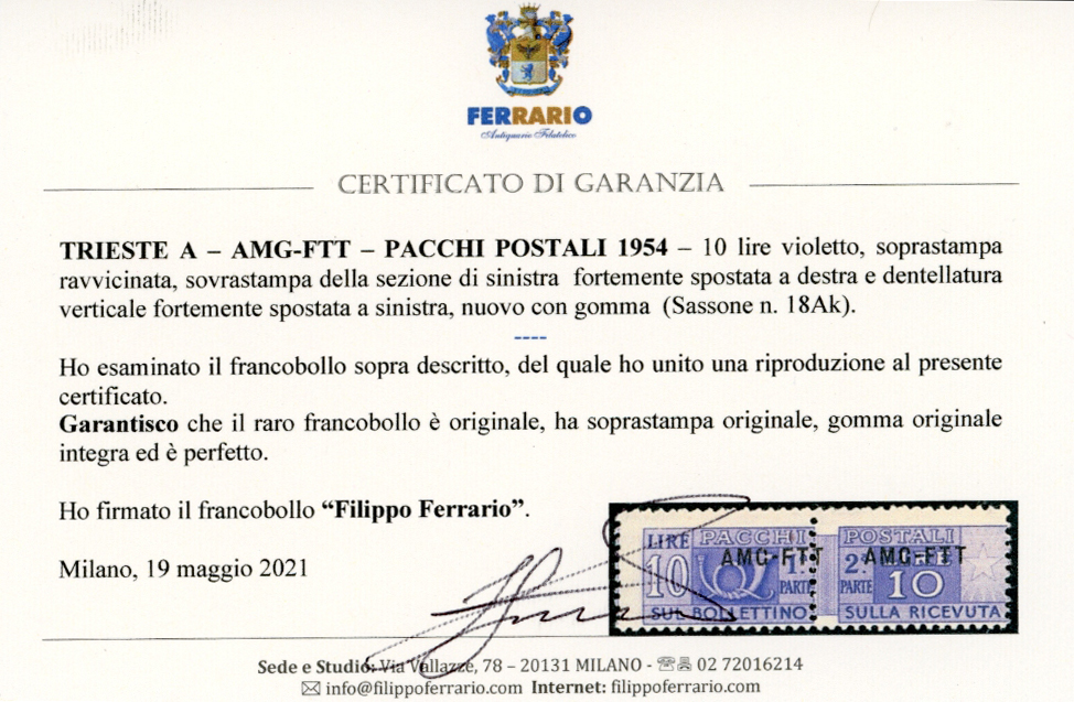 PACCHI POSTALI 1949 - 10 lire soprastampa ravvicinata, soprastampa della sezione sinistra fortemente spostata a destra e dentellatura verticale fortemente spostata a sinistra (18AK), gomma integra, perfetto. Raro. R.Mondolfo, cert. Ferrario.