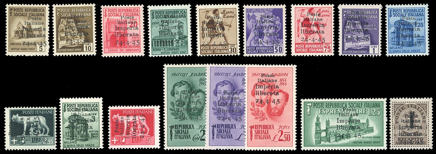 IMPERIA 1945 - Soprastampati, diciassette valori (1/15,20/21), gomma originale integra, perfetti. Alcuni valori firmati Caffaz/Raybaudi.