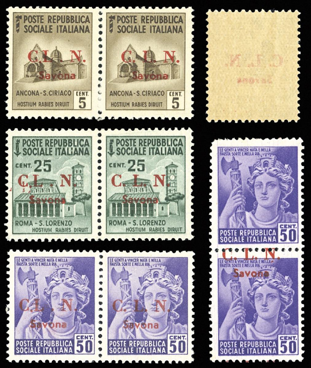 SAVONA 1945 - 5 cent., 25 cent., coppie orizzontali con il primo esemplare con "L" della soprastampa spostata a sinistra (1a,4a,6a), 50 ... Read more