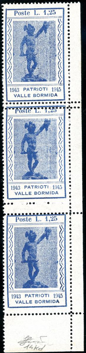 VALLE BORMIDA 1945 - 1,25 lire azzurro Perseo, striscia verticale di tre con filigrana e con doppia dentellatura tra il primo e il secondo ... Read more