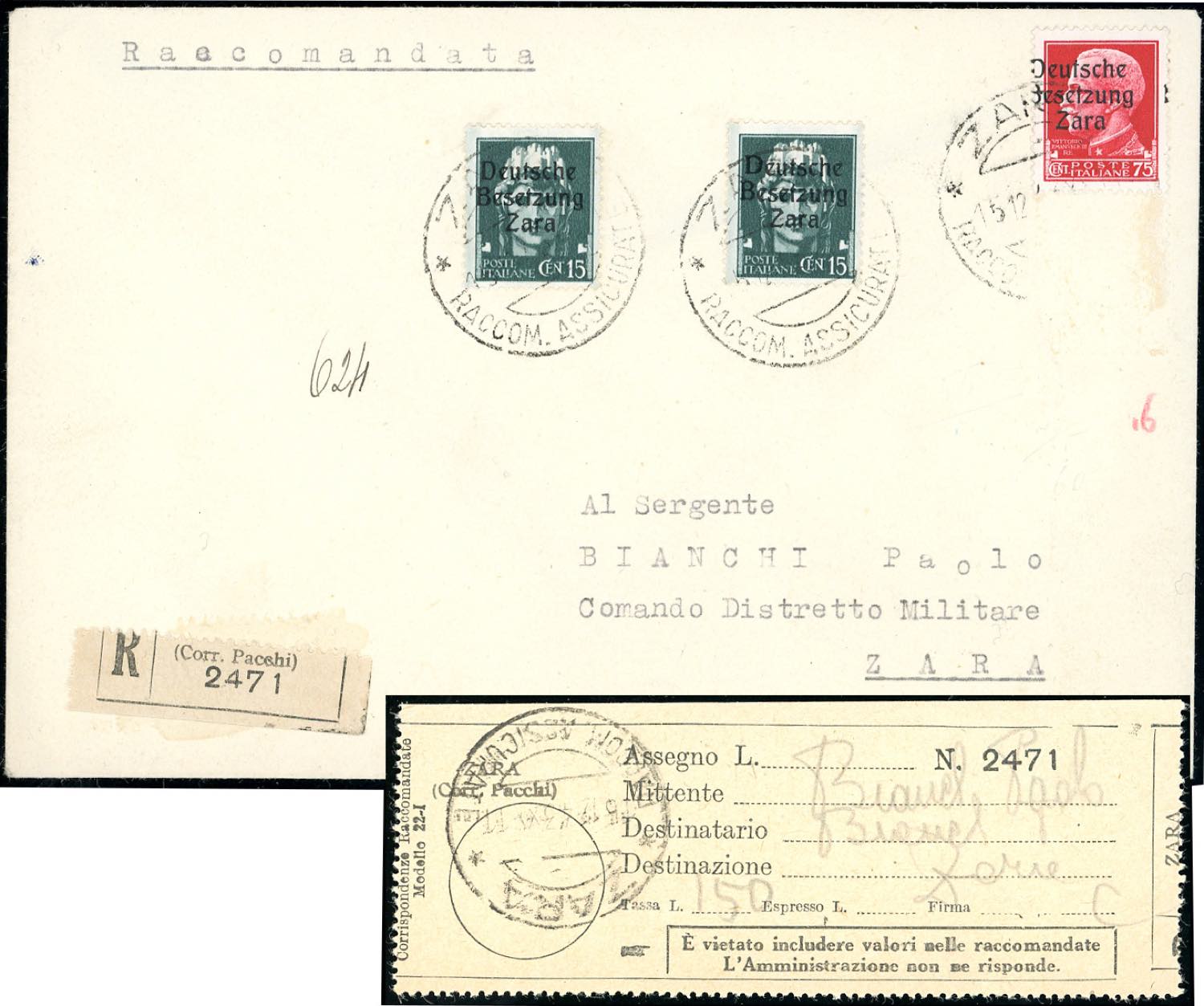 OCCUPAZIONE TEDESCA ZARA 1943 - 15 cent., due esemplari e 75 cent. soprastampati (3,8), perfetti, su busta raccomandata da Zara 15/12/1943 per città. Malgrado manchi un francobollo dall'affrancatura si tratta dell'ultima data nota d'uso dei francobolli soprastampati.