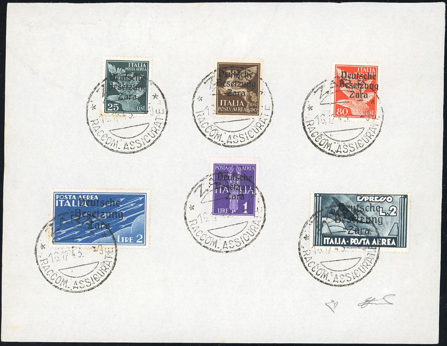 OCCUPAZIONE TEDESCA ZARA POSTA AEREA 1943 - Soprastampati "Deutsche Besetzung Zara", III tipo, sei valori (1,2,4,5,6,9), perfetti, usati su frammento a Zara 16/12/1943. E.Diena, Ferrario.