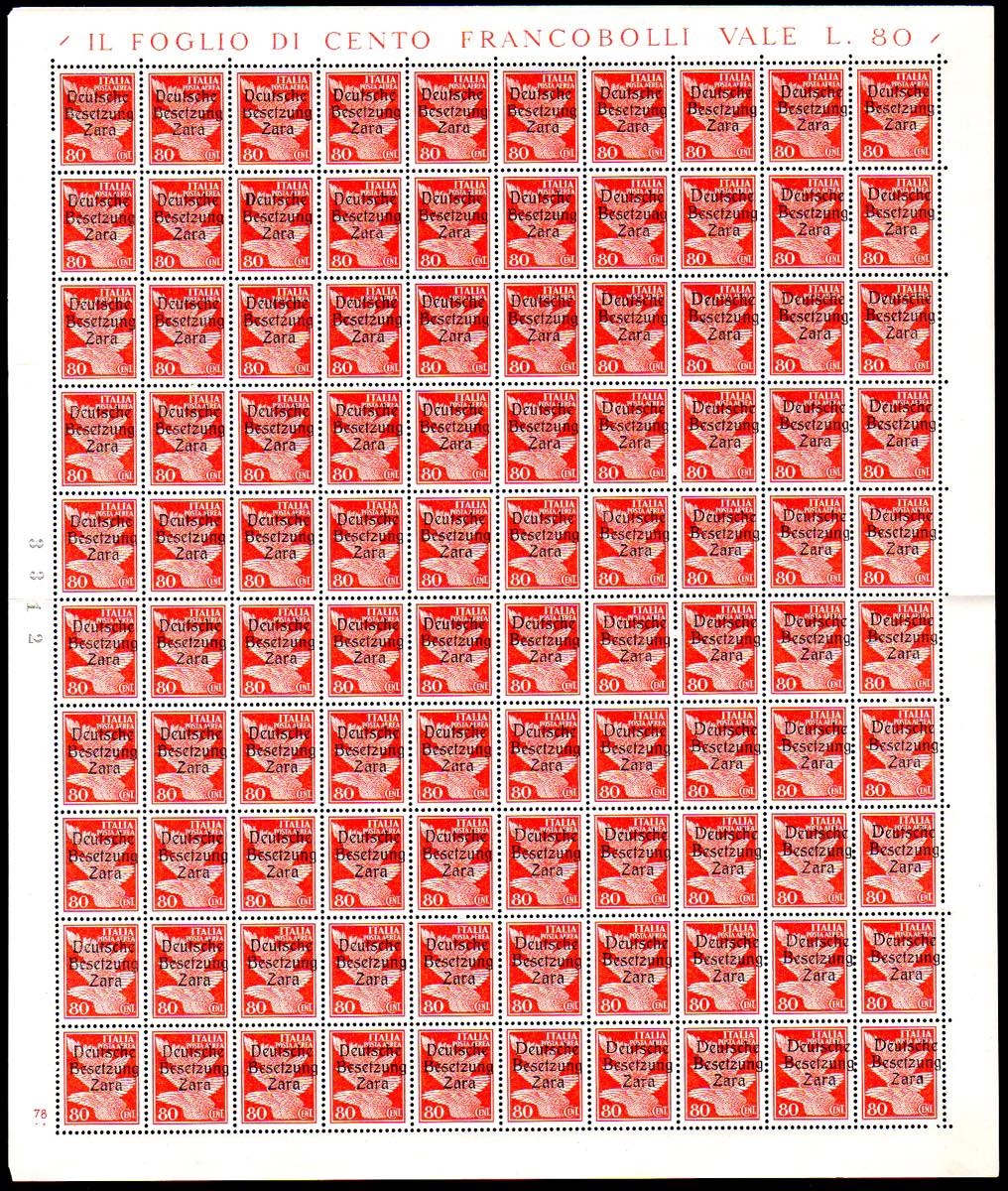 OCCUPAZIONE TEDESCA ZARA POSTA AEREA 1943 - 80 cent. soprastampato (4), foglio completo di cento esemplari, con le diverse varietà di composizione tipografica della soprastampa, gomma originale integra, perfetto. Raro e ottimo per studio. Cert. Ferrario.