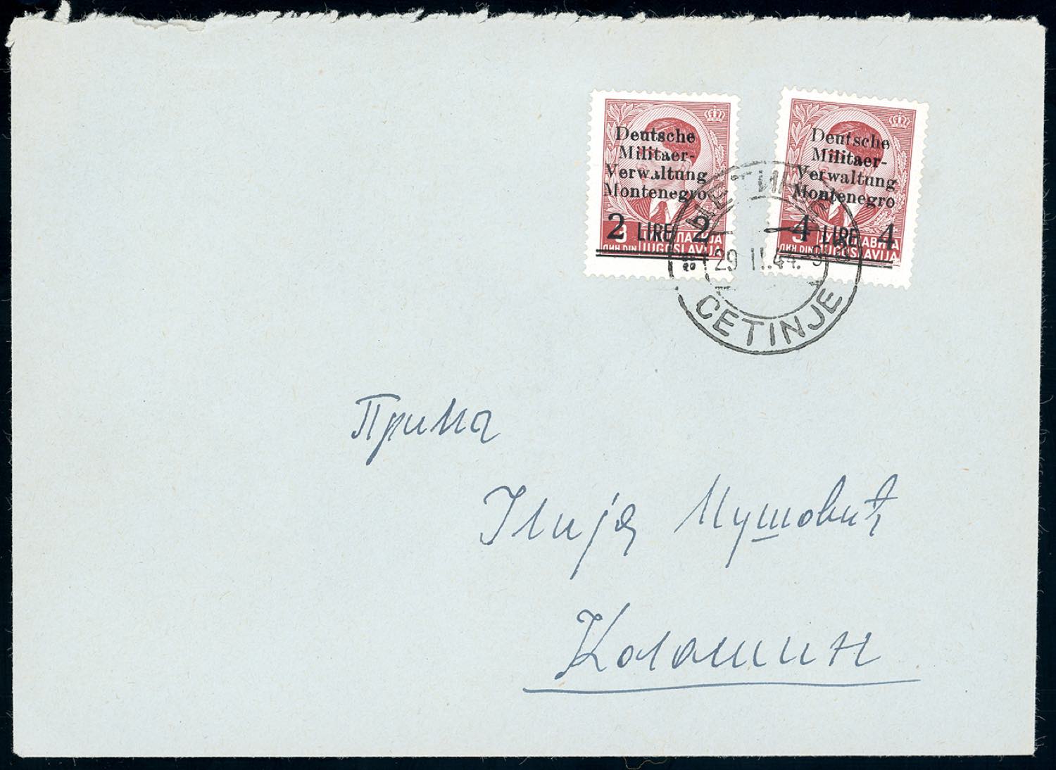 OCCUPAZIONE TEDESCA MONTENEGRO 1944 - 2 lire su 3 d., 4 lire su 3 d. (4,5), perfetti, su busta da Cettigne 29/2/1944 a Kolasin, bollo d'arrivo al verso.