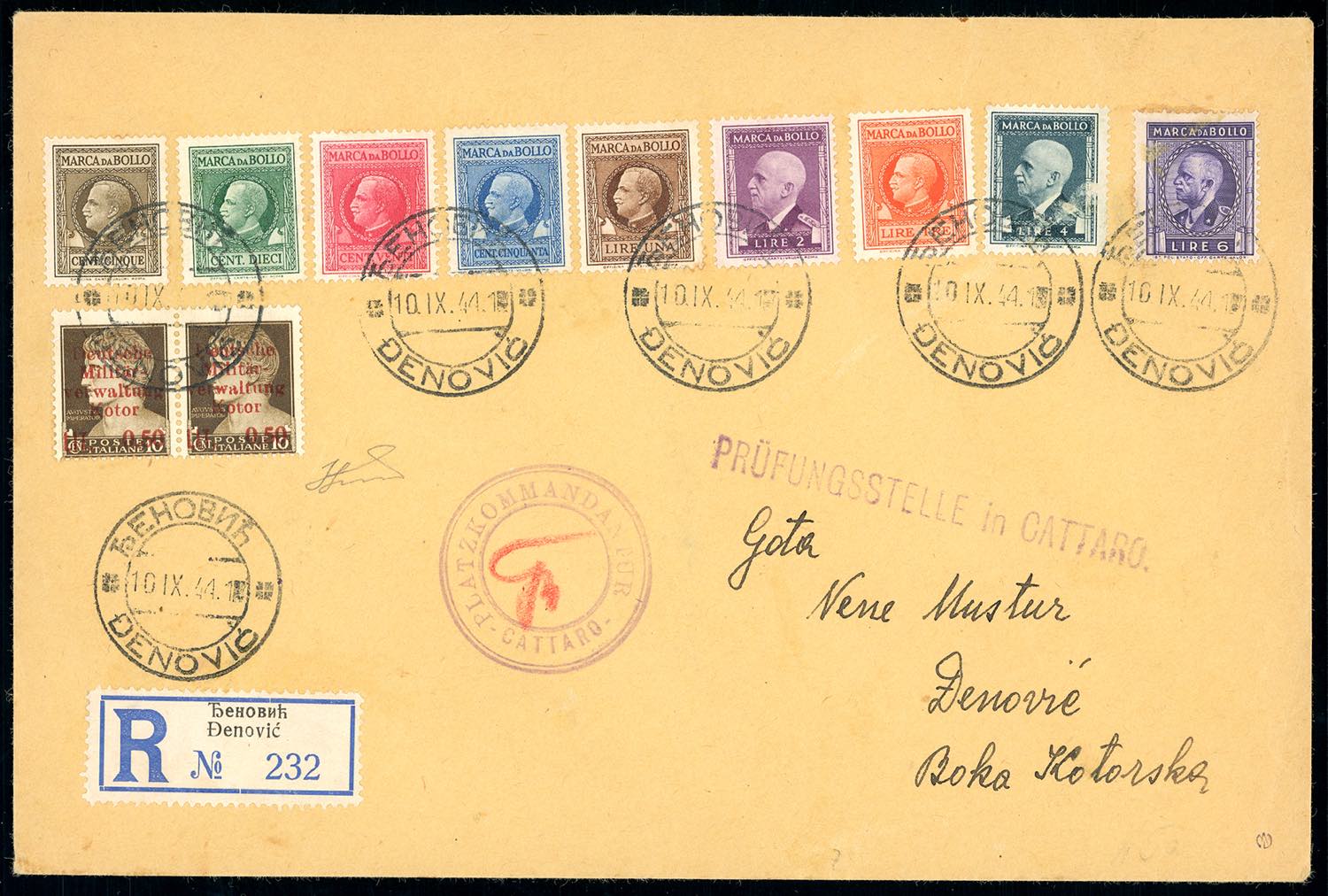 OCCUPAZIONE TEDESCA CATTARO 1944 - 0,50 l. su 50 cent., coppia perfetta (1), in affrancatura mista con marche da bollo, nove valori, due con difetti, su busta raccomandata da Denovic 10/9/1927 per città. Rara. Ferrario.