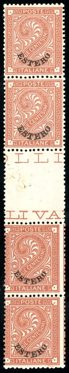 EMISSIONI GENERALI 1874 - 2 cent. De La Rue soprastampato (2), striscia verticale di quattro con interspazio di gruppo al centro, gomma ... Read more