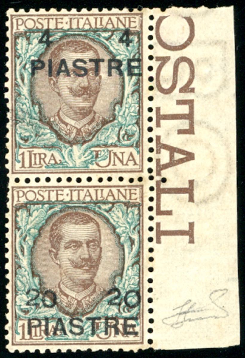 COSTANTINOPOLI 1908 - IV emissione locale, coppia verticale formata da 4 piastre su 1 lira, decalco della soprastampa, e 20 piastre su 1 lira, errore di valore (18A,nota), bordo di foglio, gomma originale integra, perfetta e di ottima qualità. Combinazione di varietà non catalogata, PROBABILMENTE UNICA. E.Diena, cert. Ferrario.