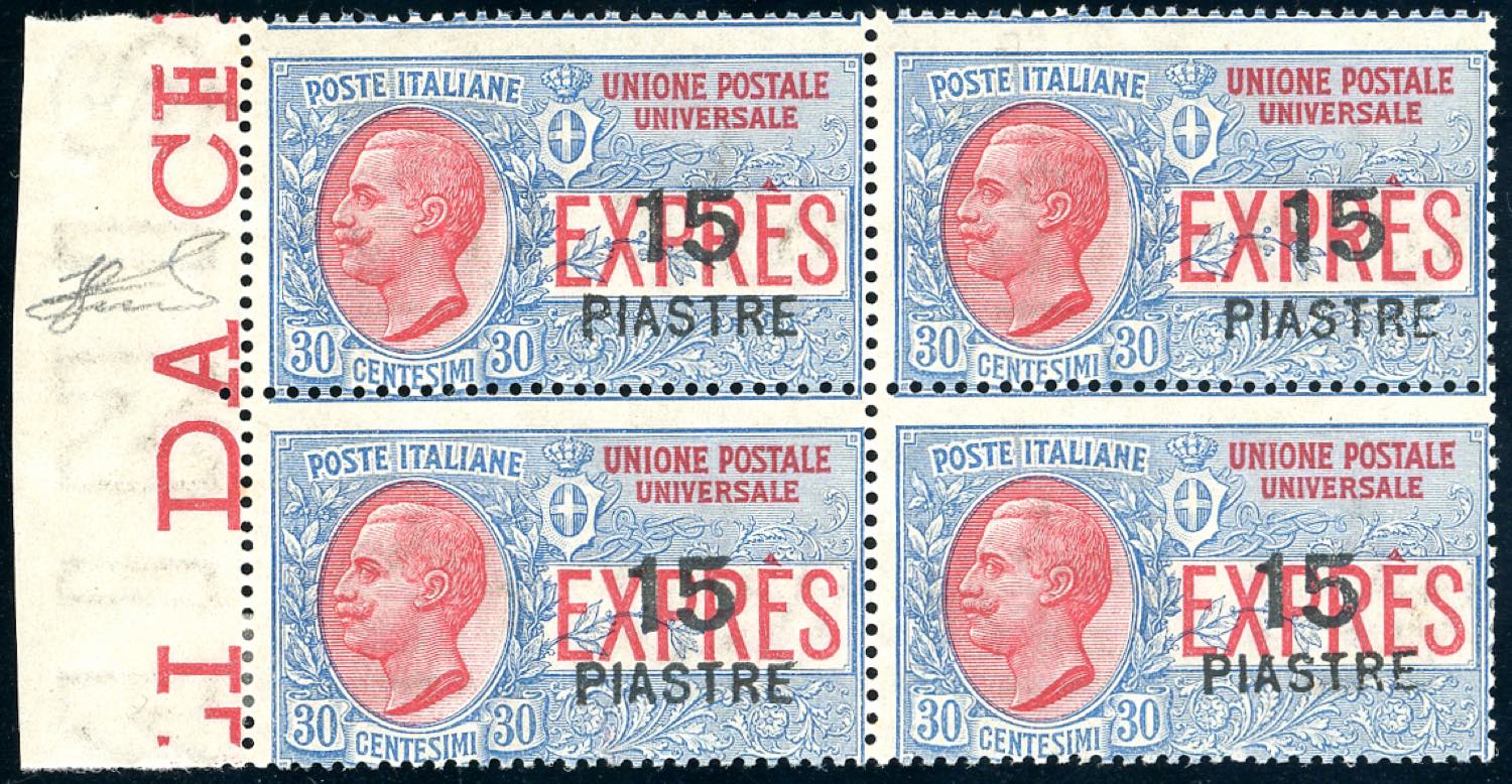 COSTANTINOPOLI ESPRESSI 1922 - 15 pi. su 30 cent. soprastampa più grande (2), blocco di quattro, gomma originale integra, perfetto. Raro. ... Read more
