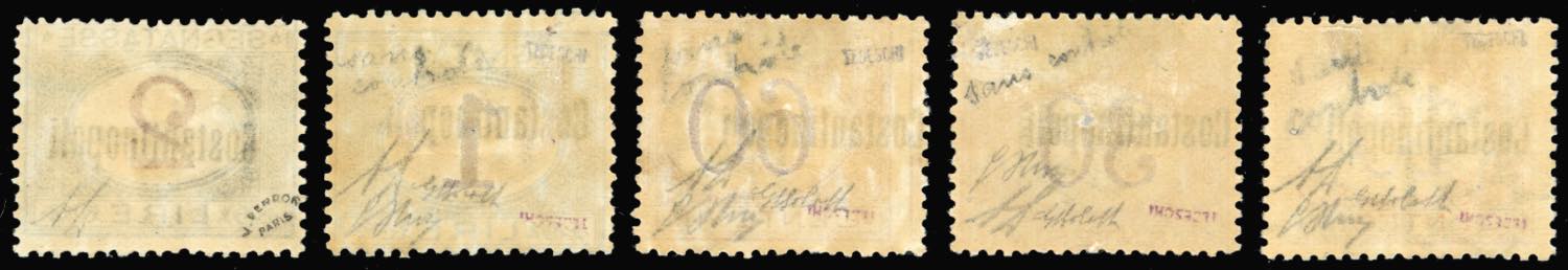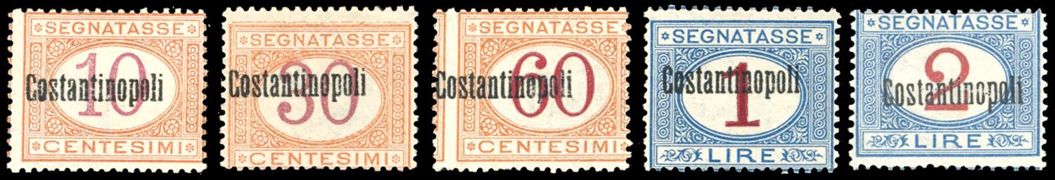 COSTANTINOPOLI SEGNATASSE 1922 - Serie completa soprastampata, senza il bollo postale di controllo (1a/5a), gomma originale, lieve traccia di linguella, perfetti. Rarissimo insieme, irripetibile per la presenza del valore da 2 lire che è l'UNICO NOTO. Uno dei pezzi "chiave" di tutto il Levante. Tutti firmati da noti periti, cert. G.Bolaffi e A.Diena per il 2 lire.