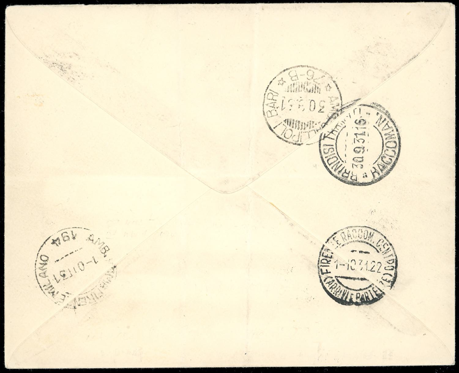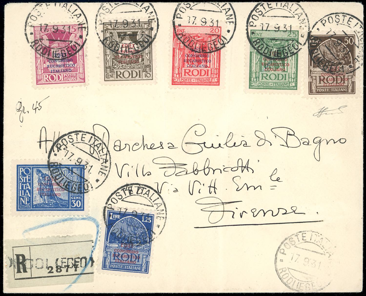 1931 - Congresso Eucaristico, serie completa (30/36), perfetti, su busta raccomandata da Rodi 17/9/1931 a Firenze, bolli d'arrivo. Ferrario.