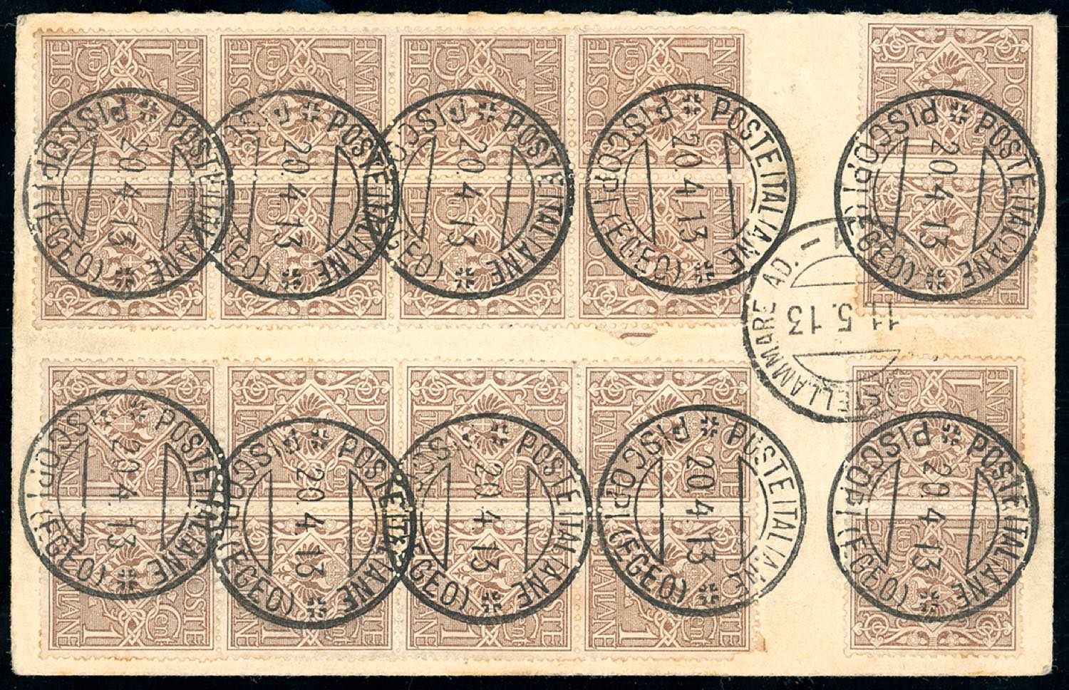 PISCOPI 1913 - 10 cent. Leoni, cartolina postale con risposta pagata, integrata con 30 cent. espresso e, al verso, 1 cent. Floreale, due blocchi di otto e due coppie (Regno E2,68), ottimo stato, da Piscopi 20/4/1913 a Porto San Giorgio. Affrancatura molto rara. Ferrario.