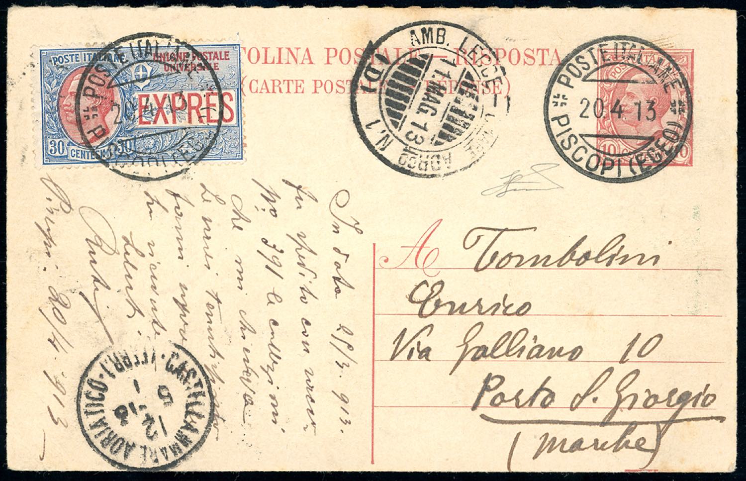 PISCOPI 1913 - 10 cent. Leoni, cartolina postale con risposta pagata, integrata con 30 cent. espresso e, al verso, 1 cent. Floreale, due ... Read more