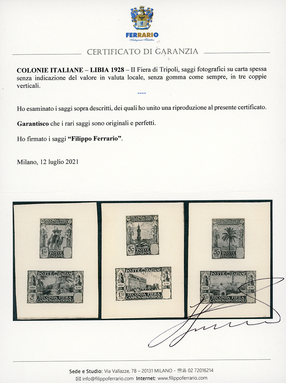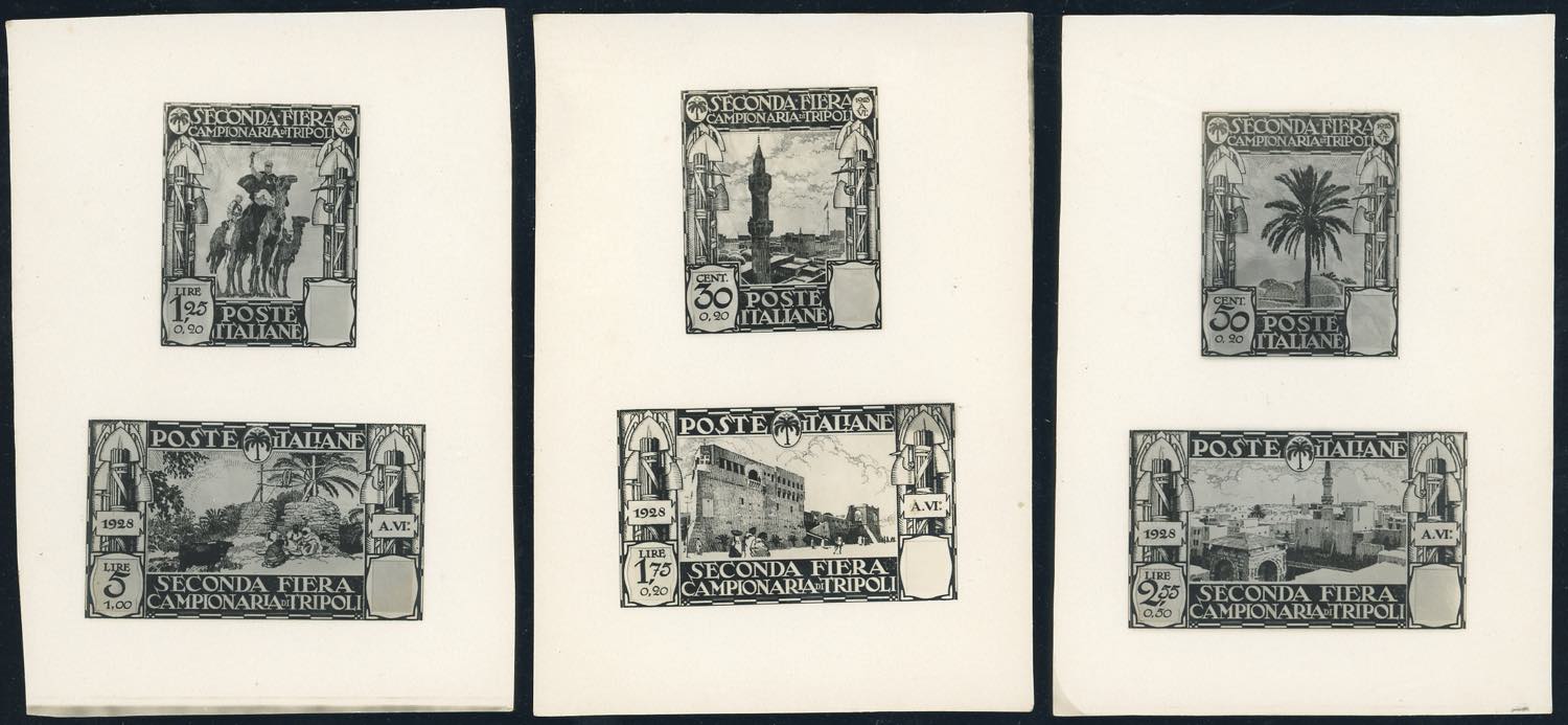1928 - II Fiera di Tripoli (72/77), saggi fotografici senza indicazione del valore in valuta locale, senza gomma come sempre, perfetti. Rari. Cert. Ferrario.