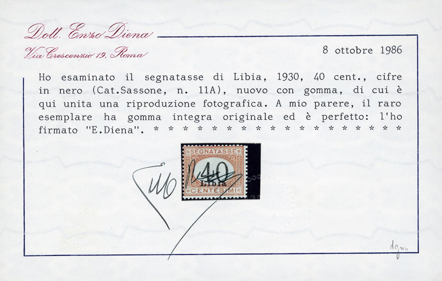 SEGNATASSE 1930 - 40 lire soprastampato, cifre in nero (11A), gomma originale integra, perfetto e molto fresco. Raro, tiratura 100 esemplari. Cert. Diena.