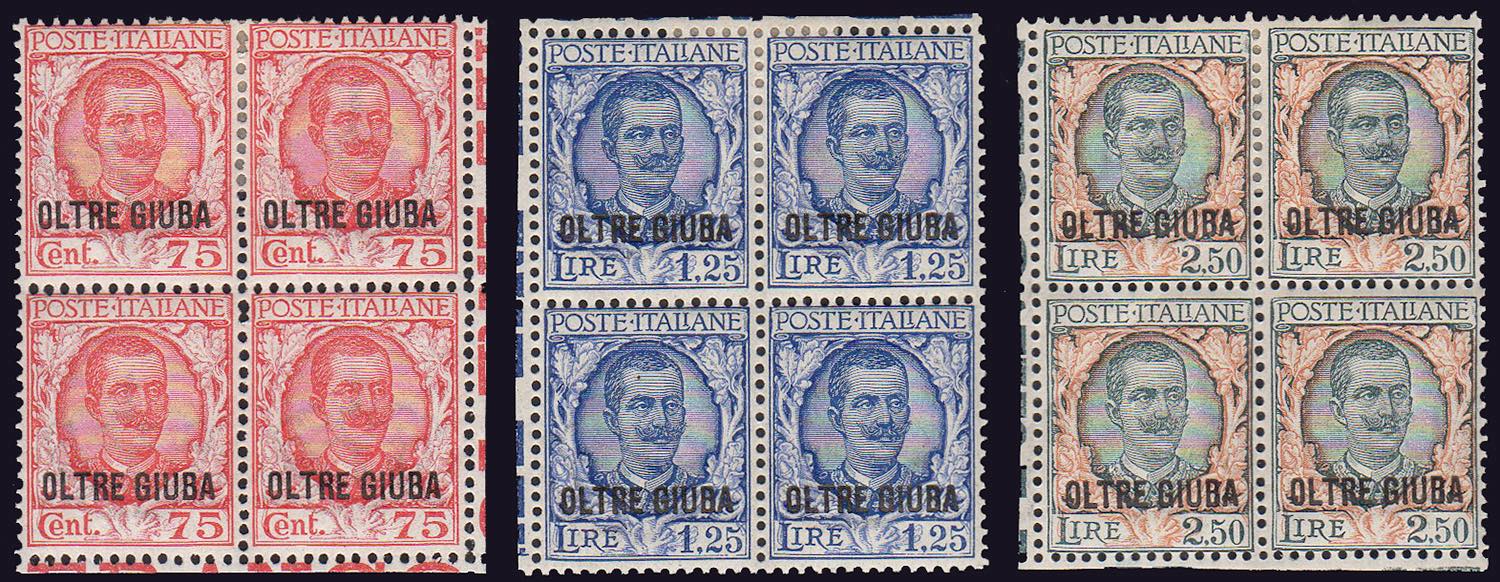 1926 - Floreale soprastampati (42/44), ottima centratura, blocchi di quattro, gomma originale, integra per i due esemplari inferiori, perfetti. Molto belli.