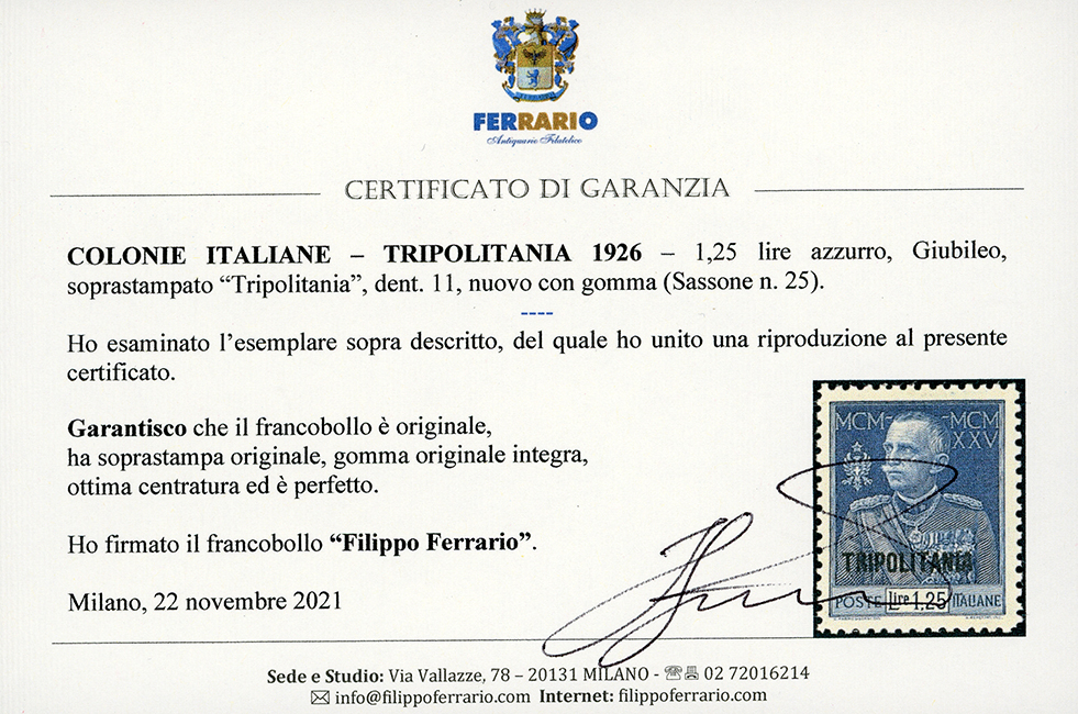 1926 - 1,25 azzurro Giubileo, dent. 11 (25), nuovo, gomma originale integra, perfetto. Freschissimo e ben centrato. A.Diena, Fiecchi, cert. Ferrario.