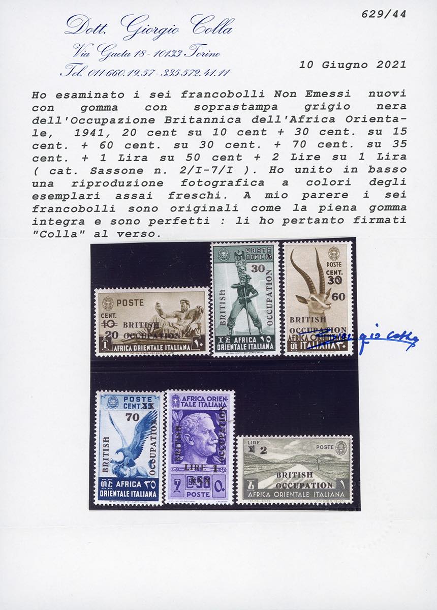 OCCUPAZIONE BRITANNICA AFRICA ORIENTALE 1941 - Soprastampati "BRITISH OCCUPATION", soprastampa grigio nera, serie completa (2/I-7/I), gomma originale integra, perfetti. Cert. Colla.