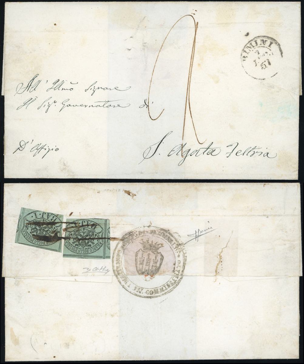 1857 - 1 baj verde grigiastro (2), due esemplari tagliati irregolarmente, al verso di sovracoperta di lettera in porto assegnato da San Marino, doppio cerchio di Rimini 7/7/1857 sul fronte, a S.Agata Feltria, tassata 2 baj. Le lettere da S.Marino con la prima emissione di Pontificio sono estremamente rare, solo una quindicina di documenti conosciuti. Colla, cert. Sorani.