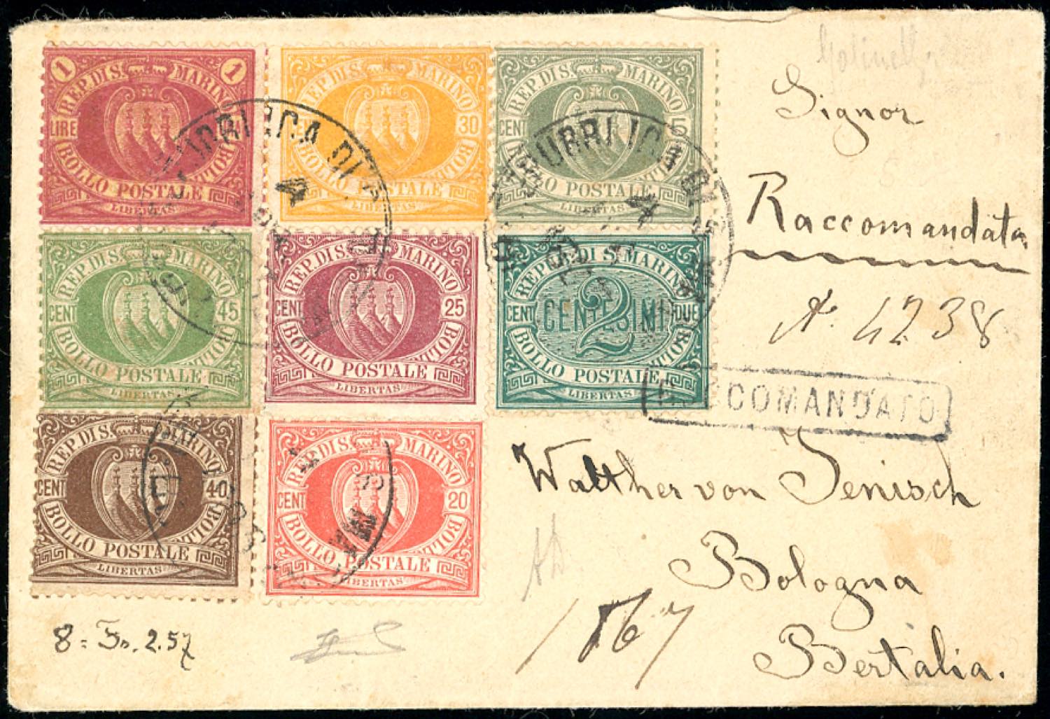 1893 - Bella affrancatura "otto colori", comprendente 1 lira carminio su giallo Stemma (1,4,5,13,16,17,18,20), perfetti, su busta raccomandata da San Marino 4/4/1893 a Bologna. Rara. A.Diena, Ferrario, Golinelli.