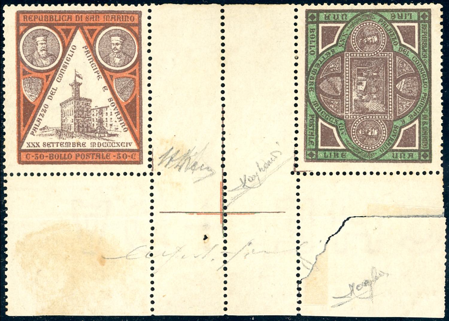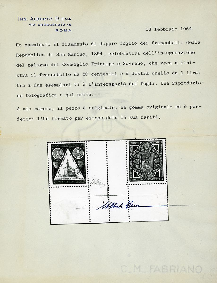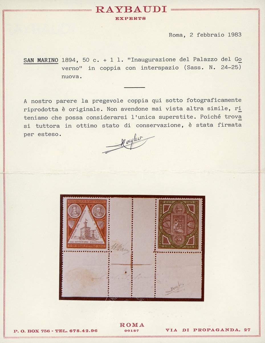 1894 - Coppia orizzontale con interspazio di gruppo al centro dei valori da 50 cent. e 1 lira Palazzo del Governo (24/25), gomma originale, leggerissima traccia di linguella, perfetta, piccola lacerazione che interessa solo il bordo di foglio del francobollo da 1 lira. Estremamente rara, PROBABILMENTE UNICA! Fiecchi, cert. A.Diena e Raybaudi.